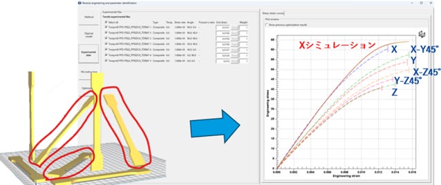 3Dプリンタによる造形は、設計の形状自由度が高く、樹脂化による軽量化が期待できる製造方法です。しかし、造形方向や繊維方向によって力学特性が異なるため(異方性)、従来は製品強度の予測が困難でした。今回追加された東レの材料データを活用することで、「Digimat」ユーザーは、造形方向や繊維方向による異方性を考慮した高精度なシミュレーションが可能となります。構造解析ソフトウェアと連携することで、実際の使用条件に即した強度予測を実現し、材料パラメータを独自に作成する手間なく、初回から精密な解析が可能です。これにより、試作回数の削減と開発期間の短縮が期待できます。また、材料特性を最大限に活かした形状最適化や、造形方向と繊維方向を考慮した最適配置により、軽量化と高強度を両立する設計が実現できます。