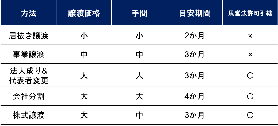 店舗の地域、譲渡額、買主 / 売主の意向を加味してうえで、適切なスキームを選択する必要があります。