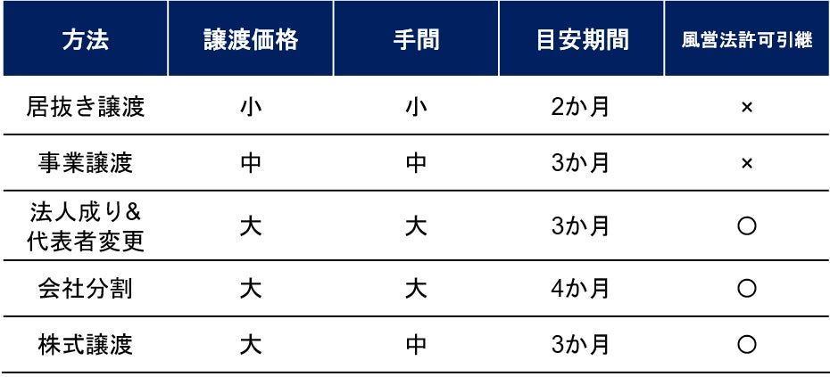 手続きが比較的簡便な居抜き譲渡・事業譲渡では風営法の許可引継ぎができません。ただし、都道府県によっては、事業譲渡でも営業を止めずに買い手企業に店舗を引き継ぐことができます。