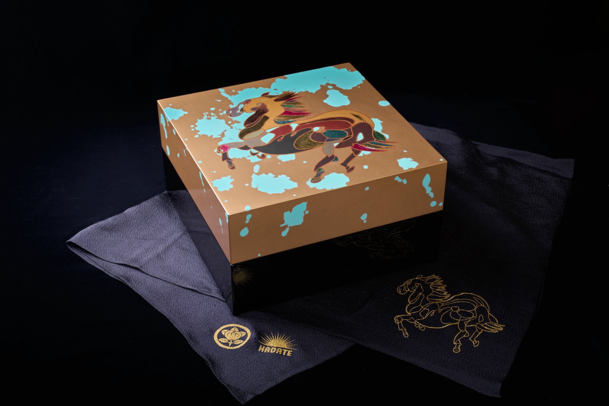 今にも駆け出しそうな干支の馬は、国内外で活躍する美術家 Nao Morigo が新年の祈りと希 望を込めて描き下ろしたアートワークをもとに、漆琳堂が日本の伝統工芸である蒔絵の技法で表現し、「生うに 暁」専用の木製総漆塗り箱~午~として制作しました。風を受けて靡く馬の立て髪や尾には贅沢に箔を施し、生命力あふれる勢いを象徴的に描出。背景には、Nao Morigo作品の特徴である湧き上がる緑青の青を、漆ならではの深みと艶で忠実に再現しています。