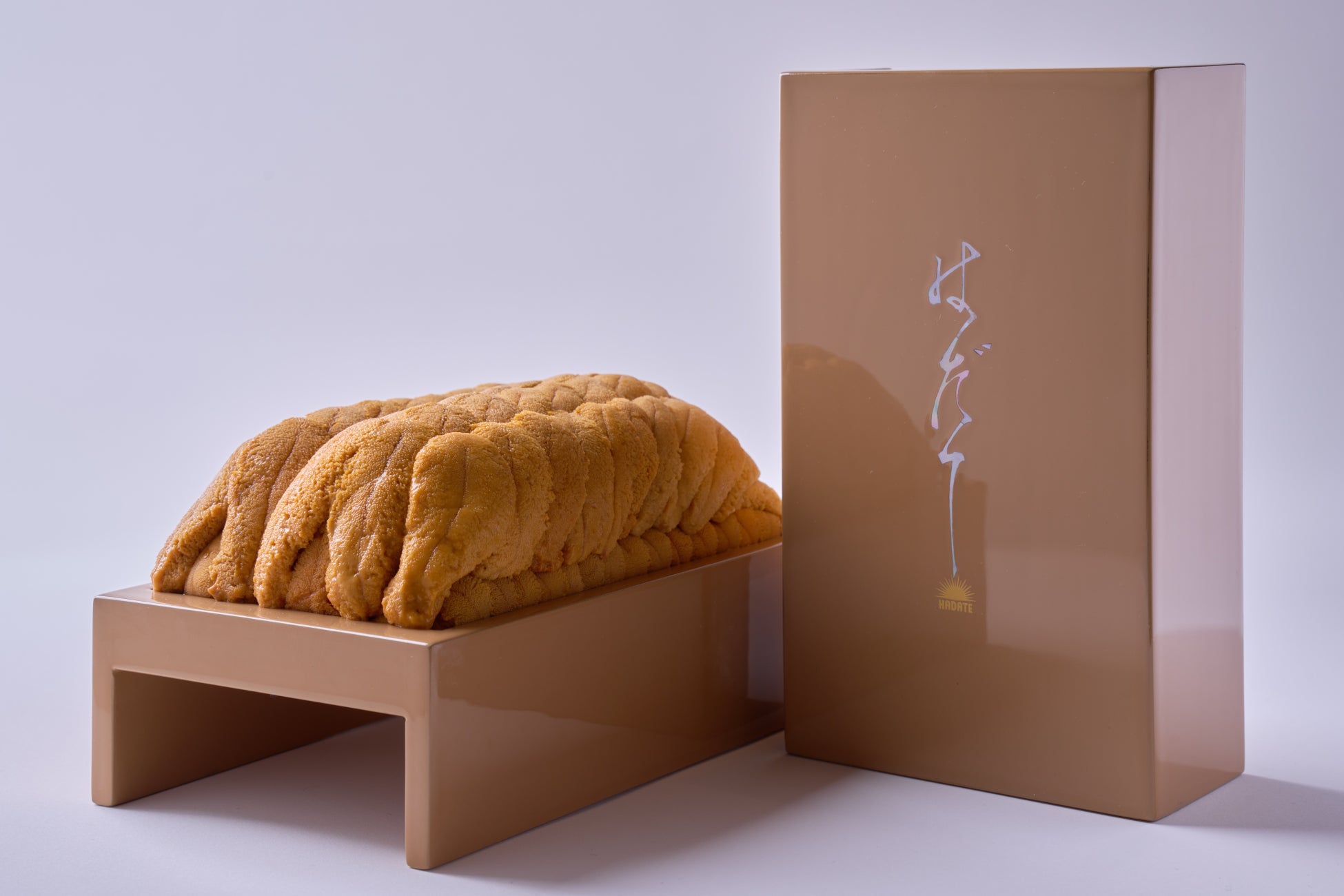 『はだての生うに』を納める木製総漆塗り箱~午~は、大本山永平寺御用達の漆器工房・漆琳堂 が制作しました。創業1793年(寛政5年)、初代・忠治郎から受け継がれる伝統の技を、漆芸家・ 内田徹が現代的なデザインへと昇華させています。 玉手箱の木地は指物の技法を用いて特注で制作し、塗りは黒本漆による“塗り立て仕上げ”。磨きをかけず、一度の刷毛塗りのみで深い艶を生み出す高度な技法です。加えて金箔による装飾を施し、 形状から塗りに至るまで漆器の粋を凝縮した、格調高いパッケージに仕上げました。さらに本金粉を用いた専用の箸および匙も制作。今回新たな試みとして、うにを収める木折を白漆、ロゴを 螺鈿で仕立て、木折そのものを一つの“食器”と見立てる演出を採用し、日本ならではの「見立ての 文化」を体現しています。