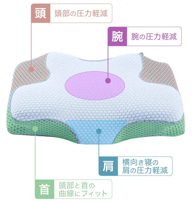 頭・首・肩・腕をそれぞれ独立して支える構造を採用し、寝返り時も頭部が安定しやすく、自然な寝姿勢をキープします。