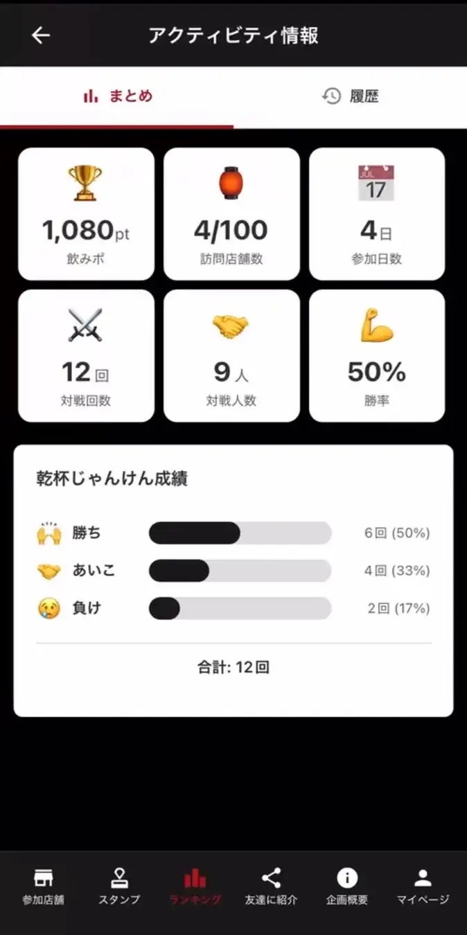 アプリには訪問店舗を一覧で確認できるスタンプラリー画面や、勝率・乾杯回数をスコア化する