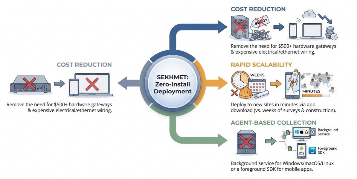 iOS・Android・macOS・Windows向けアプリにより、既存デバイスを即座にゲートウェイ化。訪問介護や仮設現場などにおける迅速な導入を可能にします。