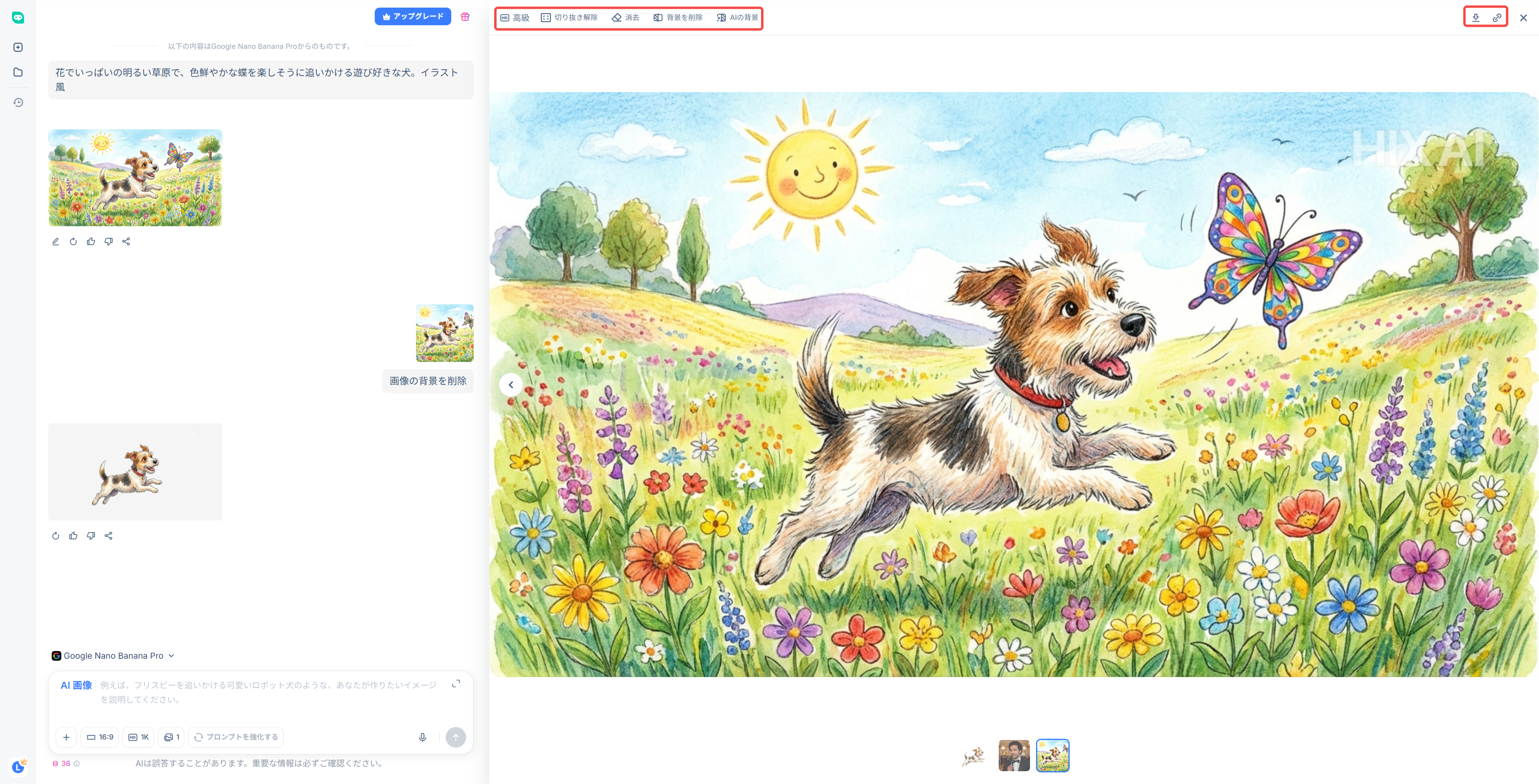 チャット形式での生成・編集:従来の AI画像生成ツールとは異なり、HIX AIでは「AIとのチャット」形式で画像生成と編集が可能です。「犬に帽子をかぶせて」「背景を夕焼けに変更」など、日本語で自然に指示するだけでAIが即座に反映します。