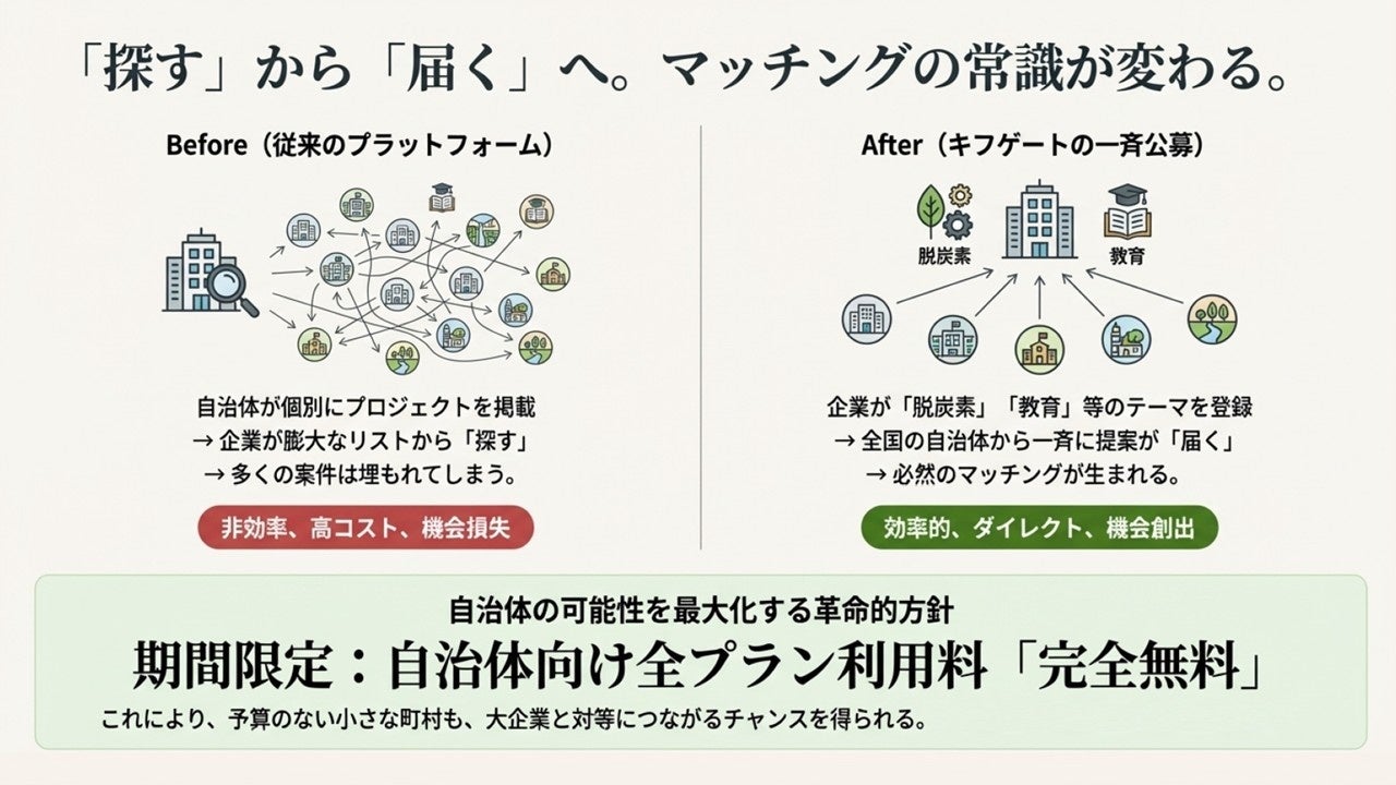 本サービスは業界初となる「企業からの一斉公募(逆公募)」機能に特化しており、自治体職員の業務負担を大幅に削減し、従来数ヶ月かかっていたマッチングを最短当日で実現します。加えて、自治体の利用料は期間限定で完全無料(仲介手数料も無料)とし、予算規模に関わらず全国すべての自治体が活用できる環境を整えております。