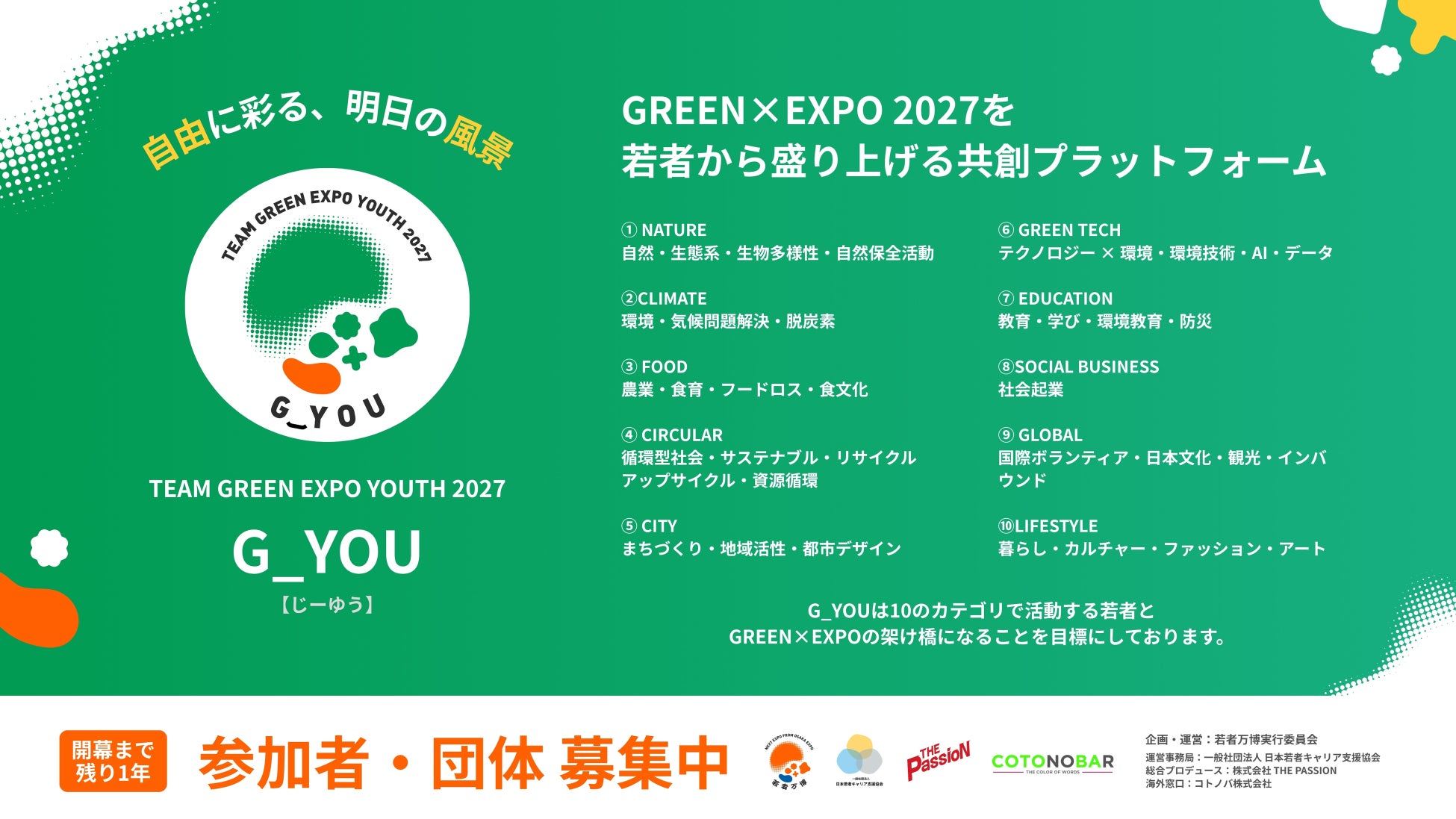 若者万博実行委員会(株式会社THE PASSION/一般社団法人日本若者キャリア支援協会)は、2027年に横浜で行われる2027年国際園芸博覧会(GREEN×EXPO)の開催1年前に際し、GREEN×EXPOを若者から盛り上げる「TEAM GREEN EXPO YOUTH "G_YOU"(チームグリーンエキスポユース”ジーユウ”) 」を立ち上げました。