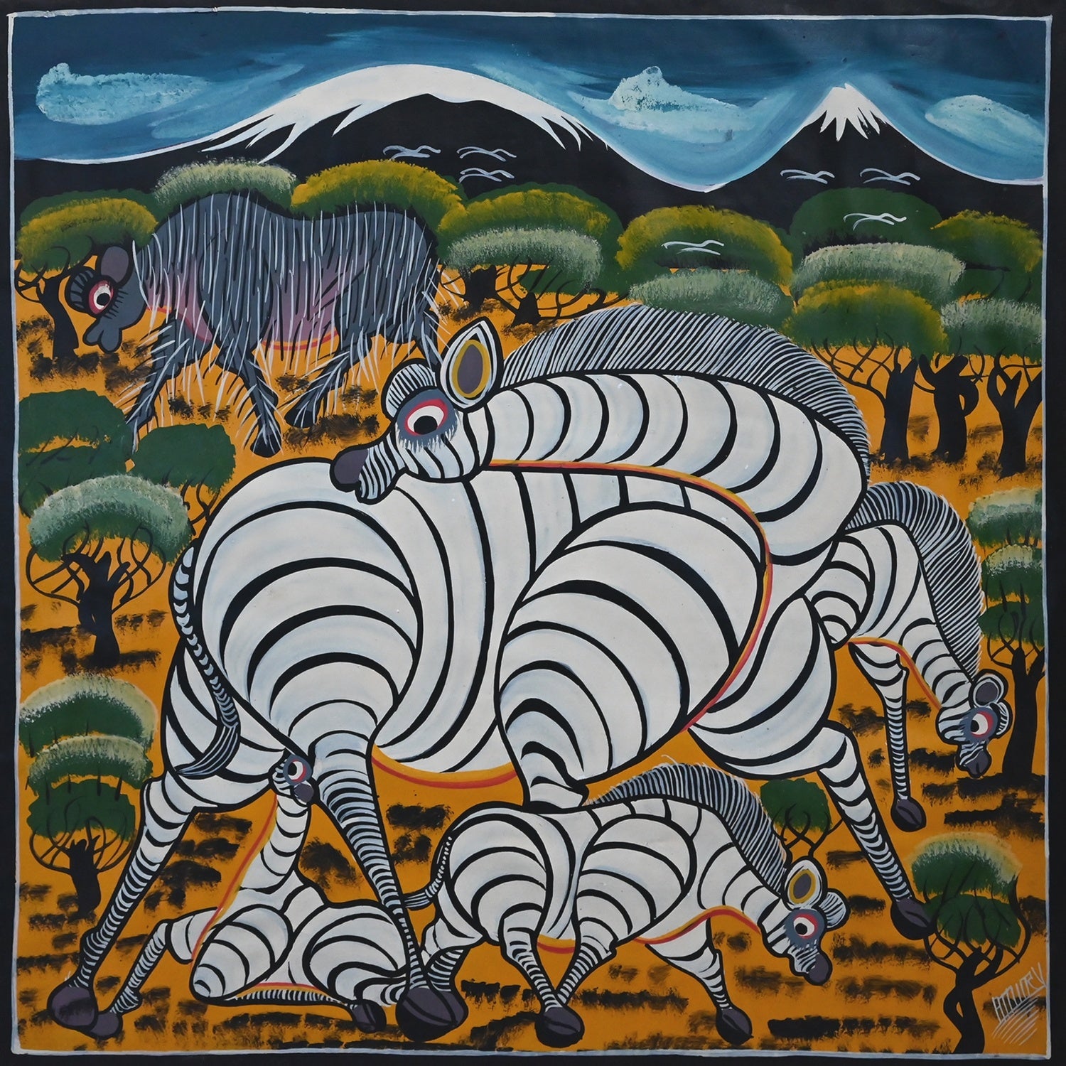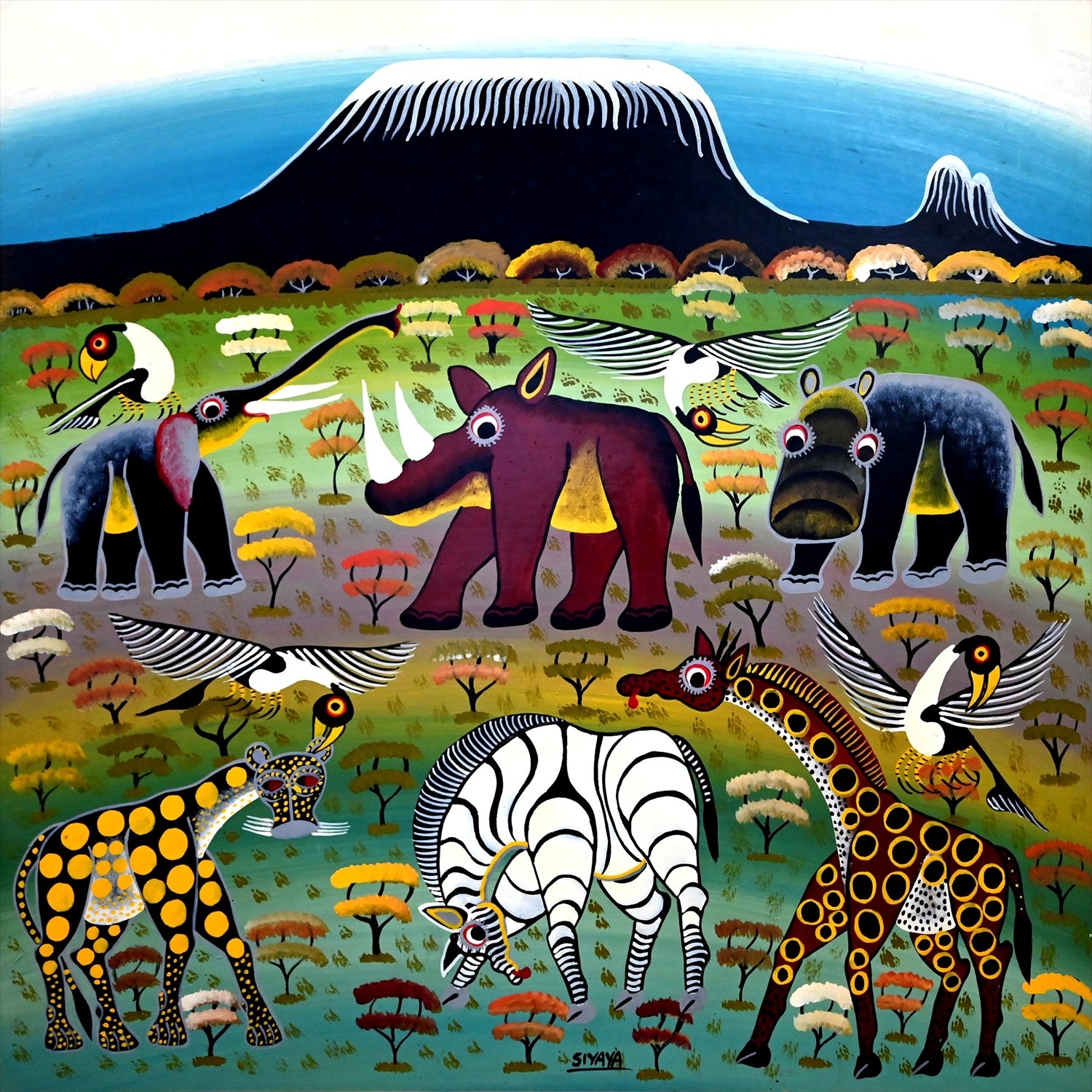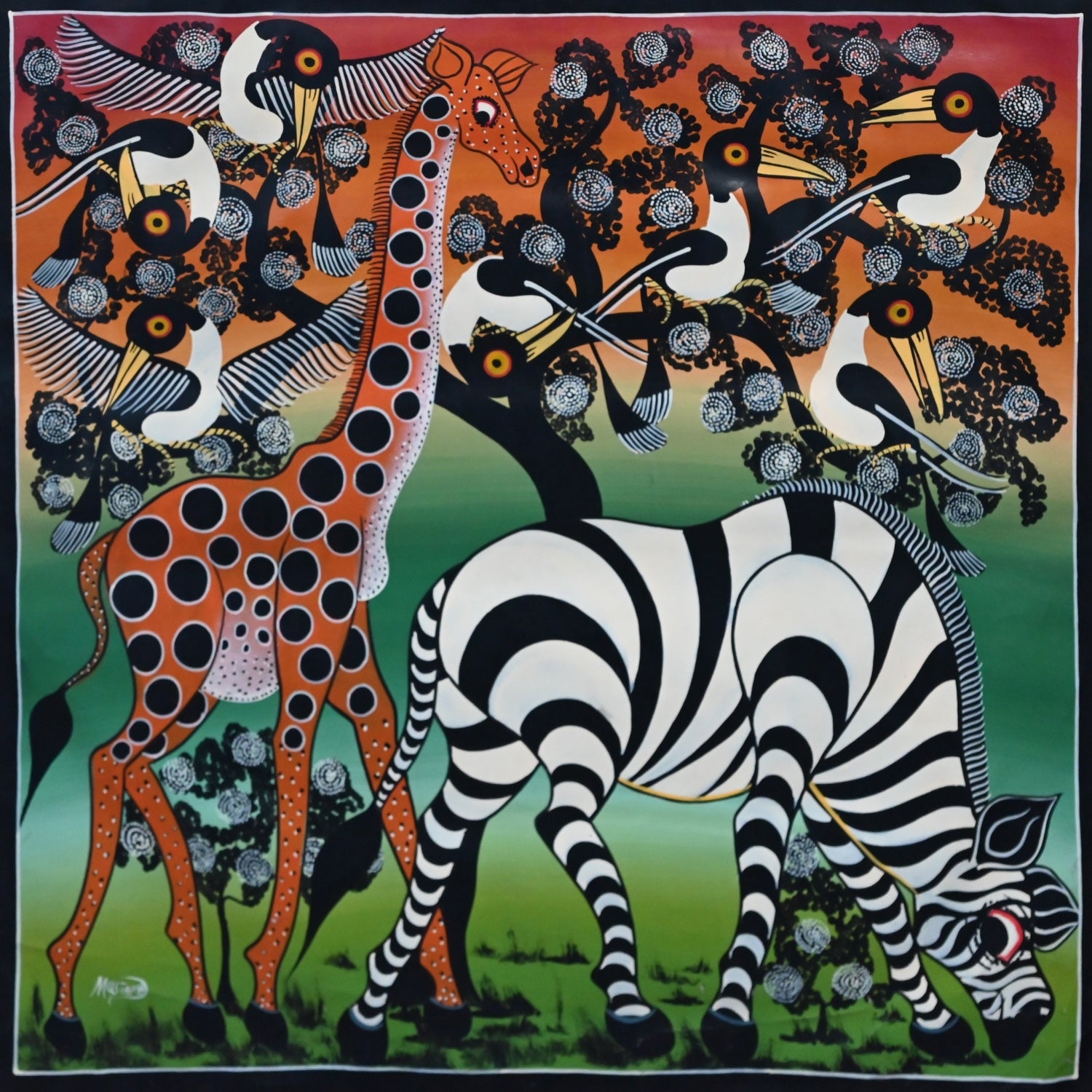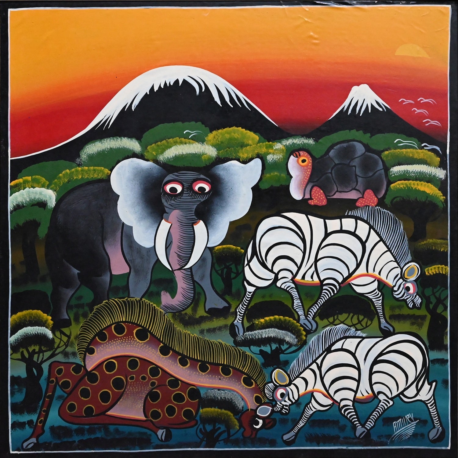 ティンガティンガ絵画は、1960年代後半にタンザニアの首都ダルエスサラームでエドワルド・サイディ・ティンガティンガによって始められた絵画スタイルです。鮮やかな色彩、平面的で装飾的な構成、そして動物や自然、人々の暮らしをユーモラスに描く表現で知られ、今ではタンザニアを代表するアートとして世界中に広く知られています。
