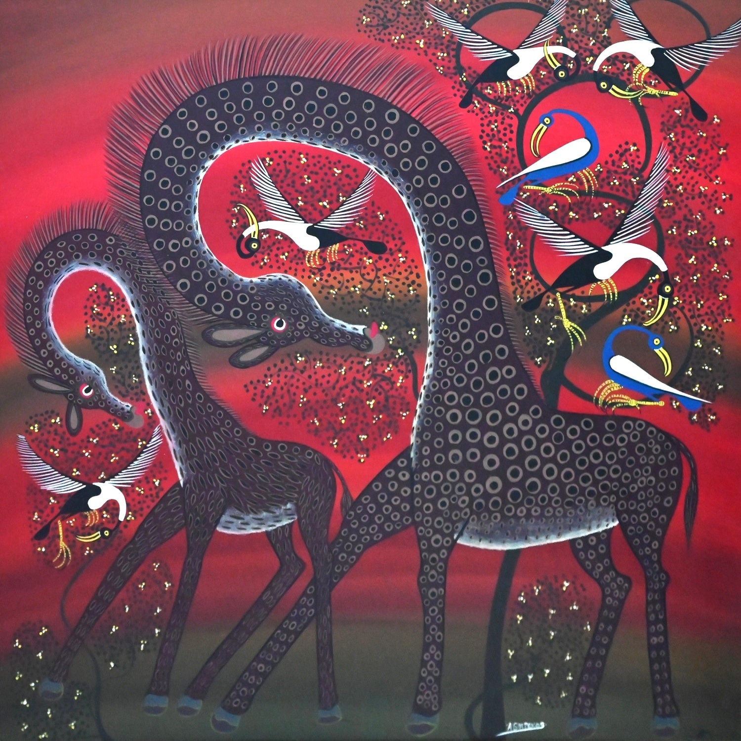 サバンナを駆ける動物たちを色鮮やかに描いたティンガティンガ絵画を紹介します