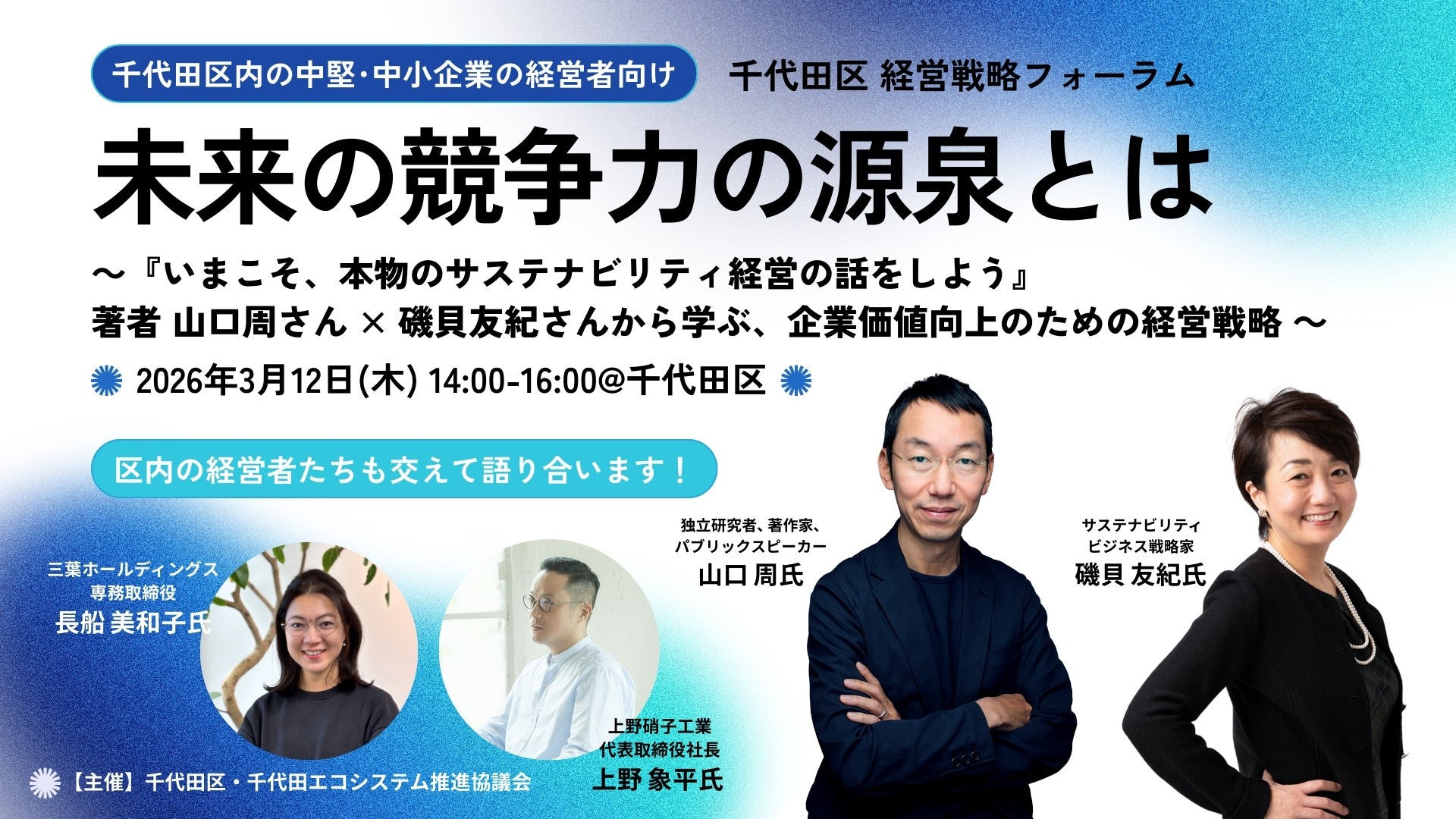 [千代田区 経営戦略フォーラム] 未来の競争力の源泉とは ~『いまこそ、本物のサステナビリティ経営の話をしよう』著者山口周さん × 磯貝友紀さんから学ぶ、企業価値向上のための経営戦略~
