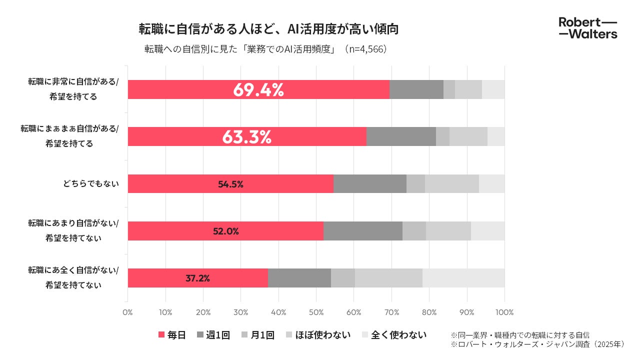 さらに、日々の業務におけるAIの活用度合いと、業界・業種内での転職への自信の関係を分析したところ、転職に「非常に自信がある」「比較的自信がある」と回答した人ほど、AIの活用度が高い傾向があることが分かりました。