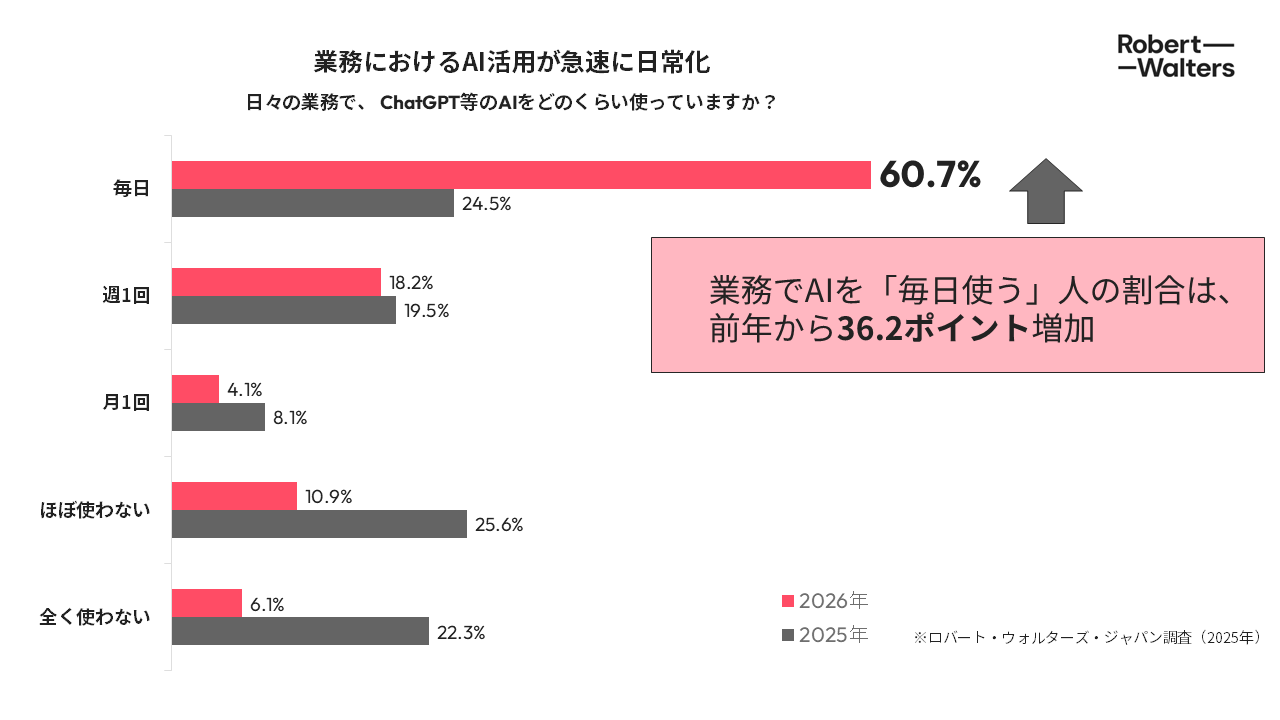 今年の調査では、職場でのAI活用が前年より大きく進展していることも明らかになりました。日々の業務でAIをどの程度活用しているか尋ねたところ、「毎日使っている」と回答した人の割合は、昨年の24.5%から今年は60.7%へと大幅に増加しました。