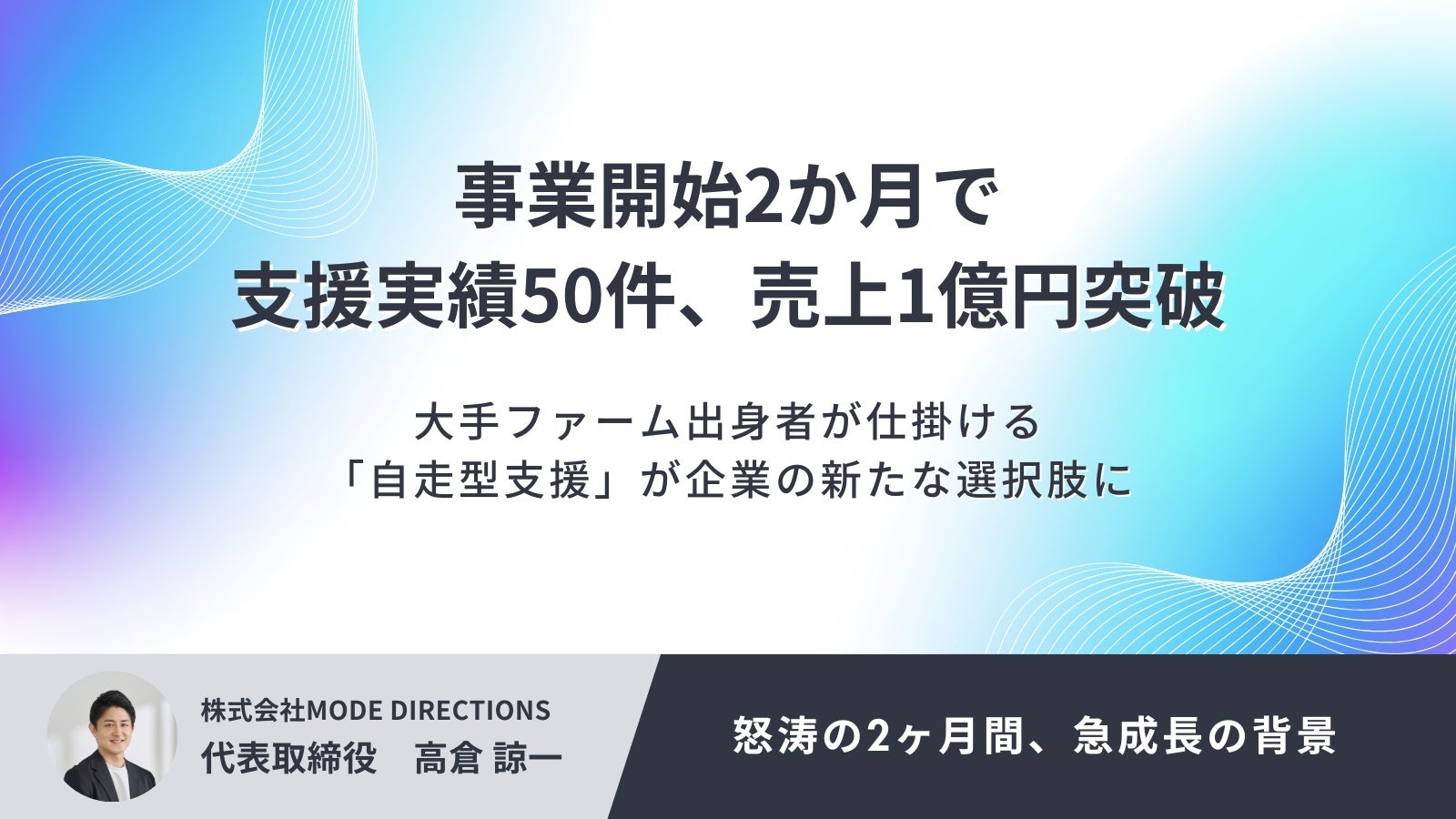 コンサルティング×事業創出で新たな価値を生み出すMODE DIRECTIONS(本社:東京都渋谷区、代表取締役:高倉諒一)は、事業開始から2ヶ月で受注50件を突破したことをお知らせいたします。