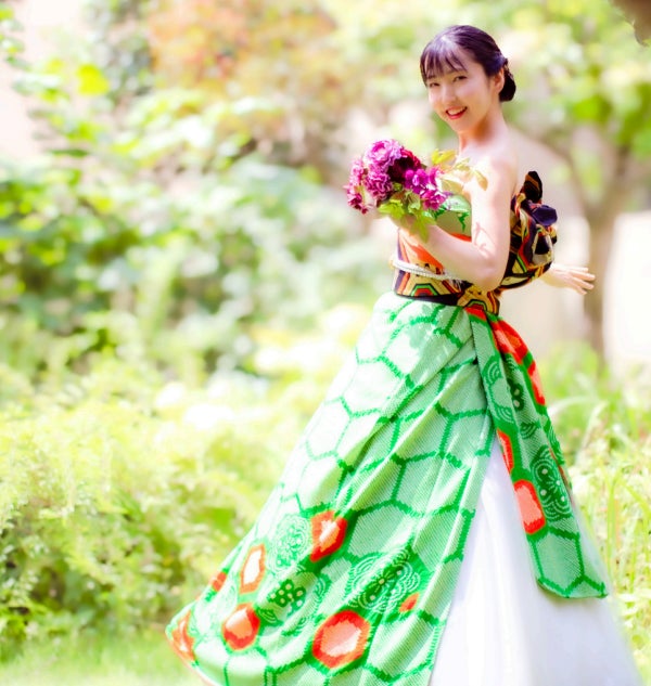 着物を切らずに、世界各国の民族衣装をイメージしたドレススタイルを表現。