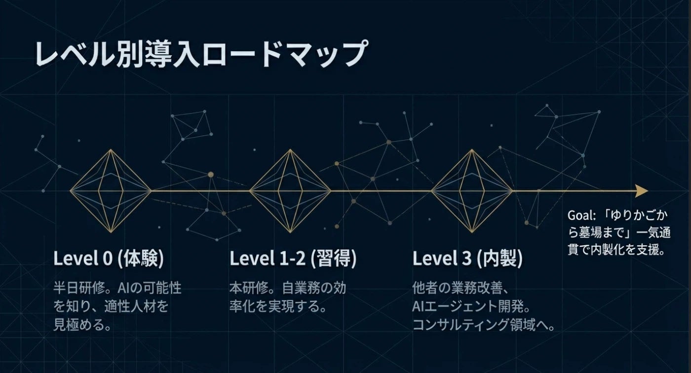 一方、これからAIを組織に浸透させたい中小企業には、実践型の研修が必要です。