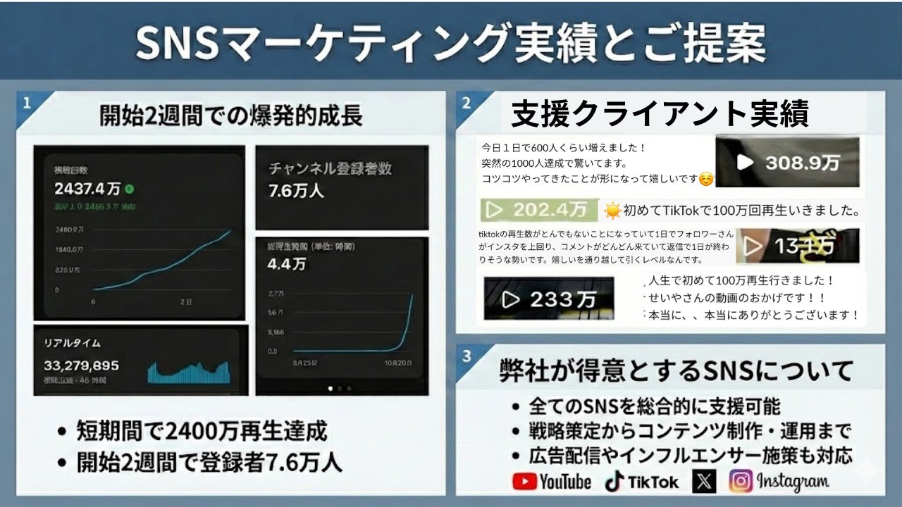 ただ投稿をお手伝いする人材ではなくクライアントの動画がバズって集客や採用につながるマーケティング支援をします!