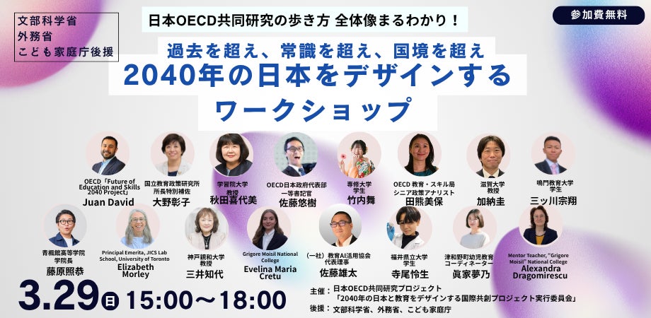 2040年の日本と教育をデザインする国際共創プロジェクト実行委員会は、2026年3月29日(日)に、OECD Education 2040に関するオンラインワークショップ「【日本OECD共同研究の歩き方 全体像まるわかり!】過去を超え、常識を超え、国境を超え、2040年の日本をデザインするワークショップ ー世界と共に、私は語るー」を開催いたします。