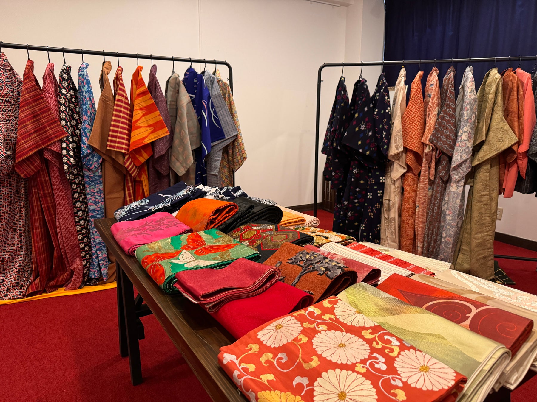 会場には130点以上の着物・帯・羽織が並びます。すべてスタッフがシミ・臭い・汚れを確認しており、安心して選ぶことができます。