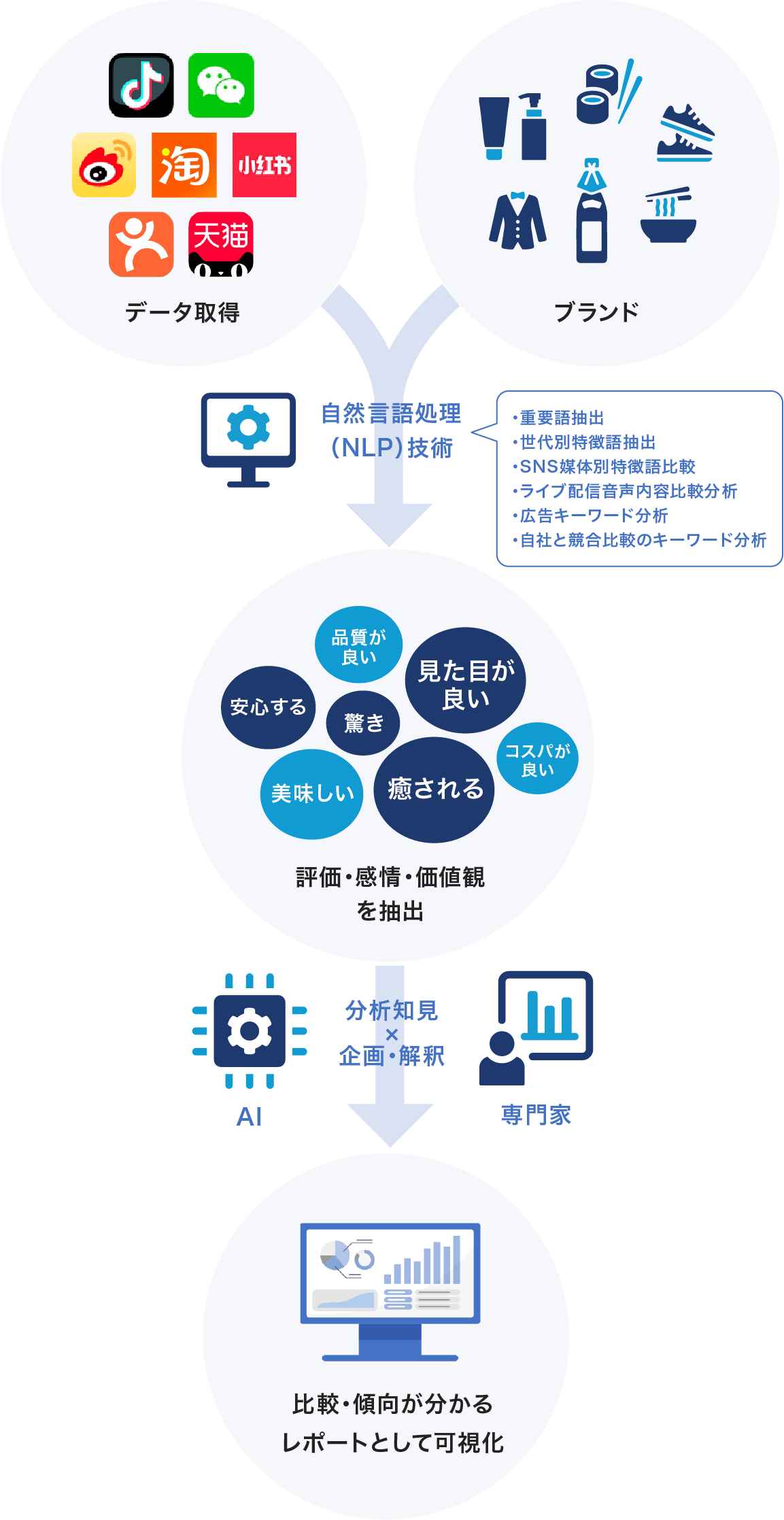 分析では、「商品やブランドごとの評価傾向」「競合商品との比較」「SNSごとの話題の違い」「時系列での関心の変化」