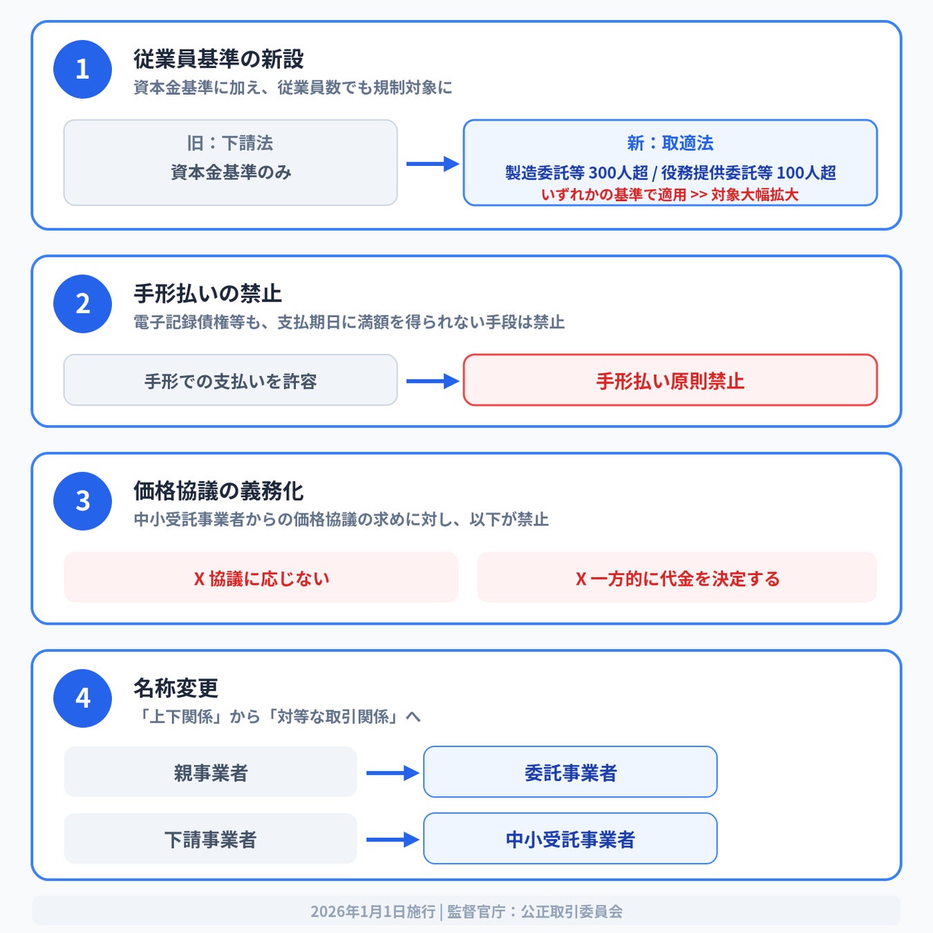 取適法の正式名称は「製造委託等に係る中小受託事業者に対する代金の支払の遅延等の防止に関する法律」です。1956年(昭和31年)に制定された下請法を約70年ぶりに抜本改正し、2026年1月1日に施行されました。主な改正ポイントは以下の通りです。
