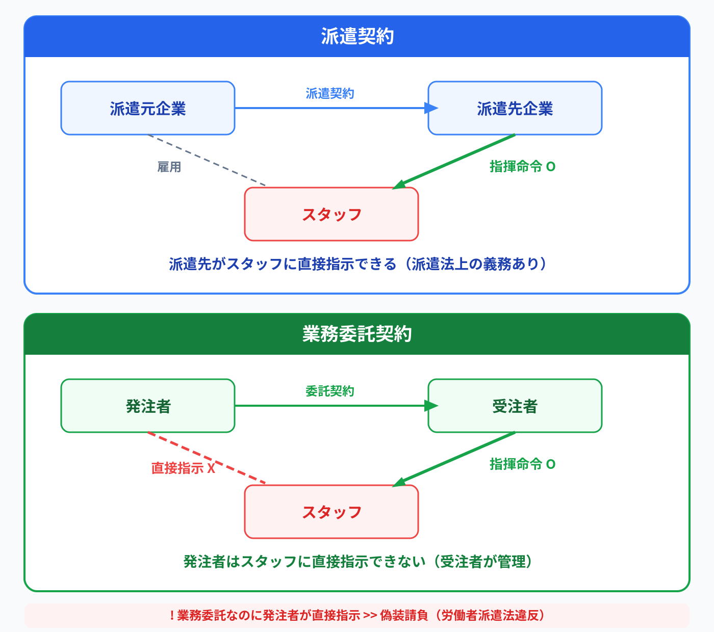 一方、業務委託契約は、受注者が自社の指揮命令系統のもとで業務を遂行し、発注者はその成果に対して対価を支払うものです。発注者が受注者のスタッフに対して直接指示を出すことは、原則として認められません。