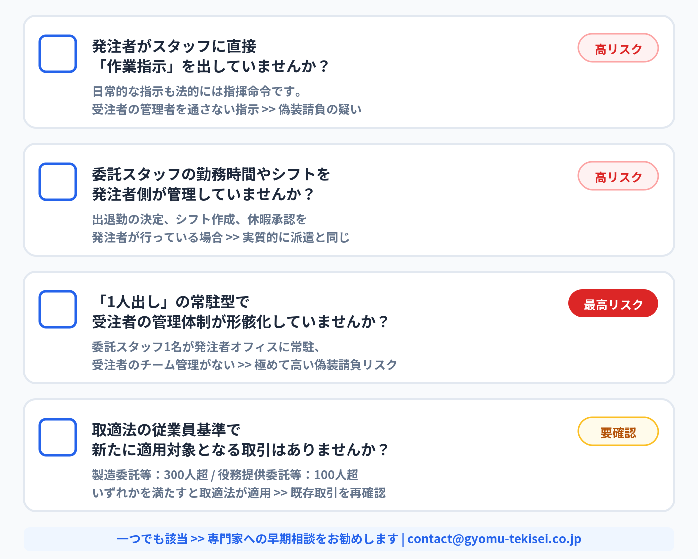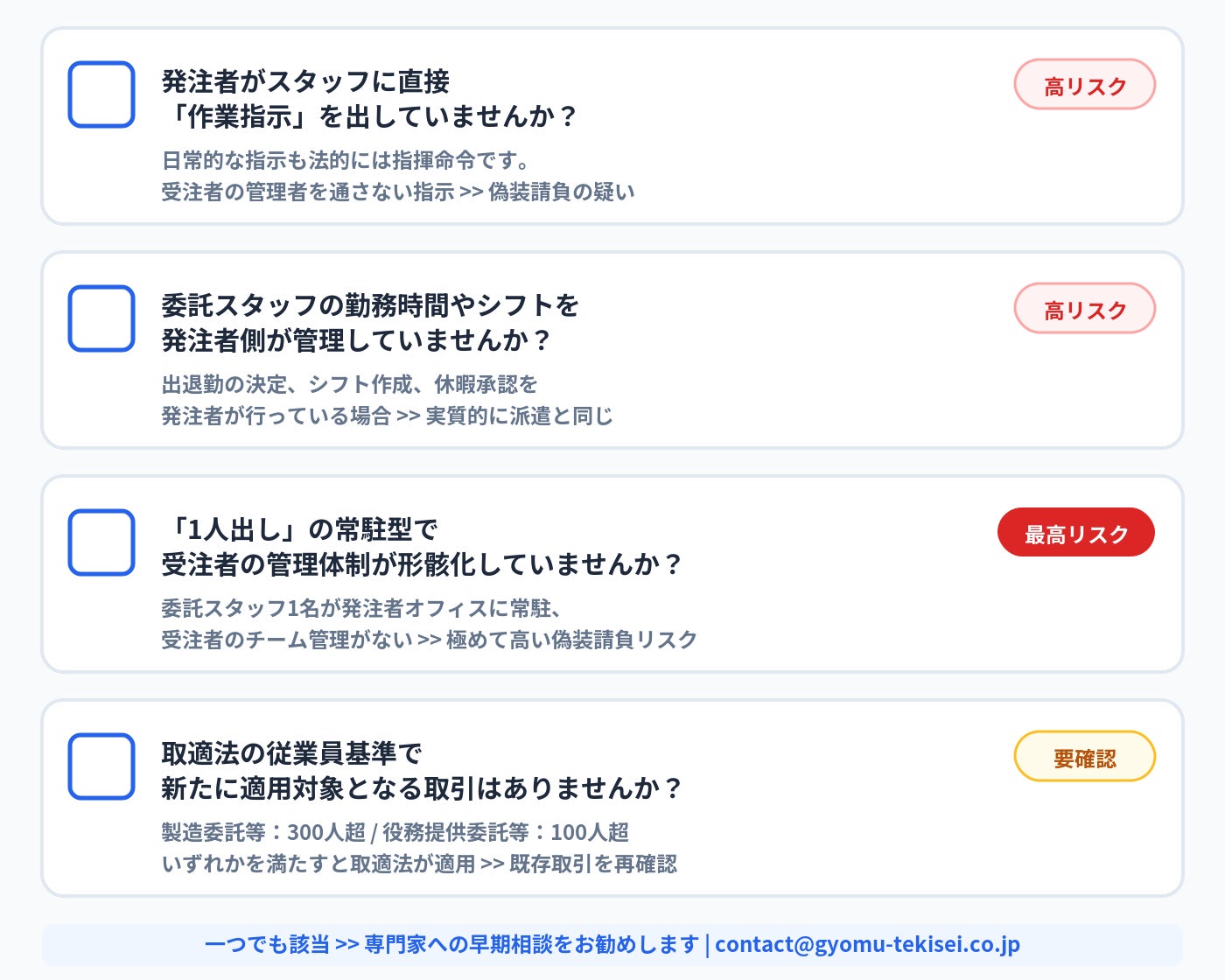 特に懸念されるのが、契約形式上は業務委託でありながら、指揮命令関係が実質的に存在する『偽装請負』のリスクである。書面上の整合性だけでなく、現場での運用実態が法的要件を満たしているかを改めて精査する必要がある。