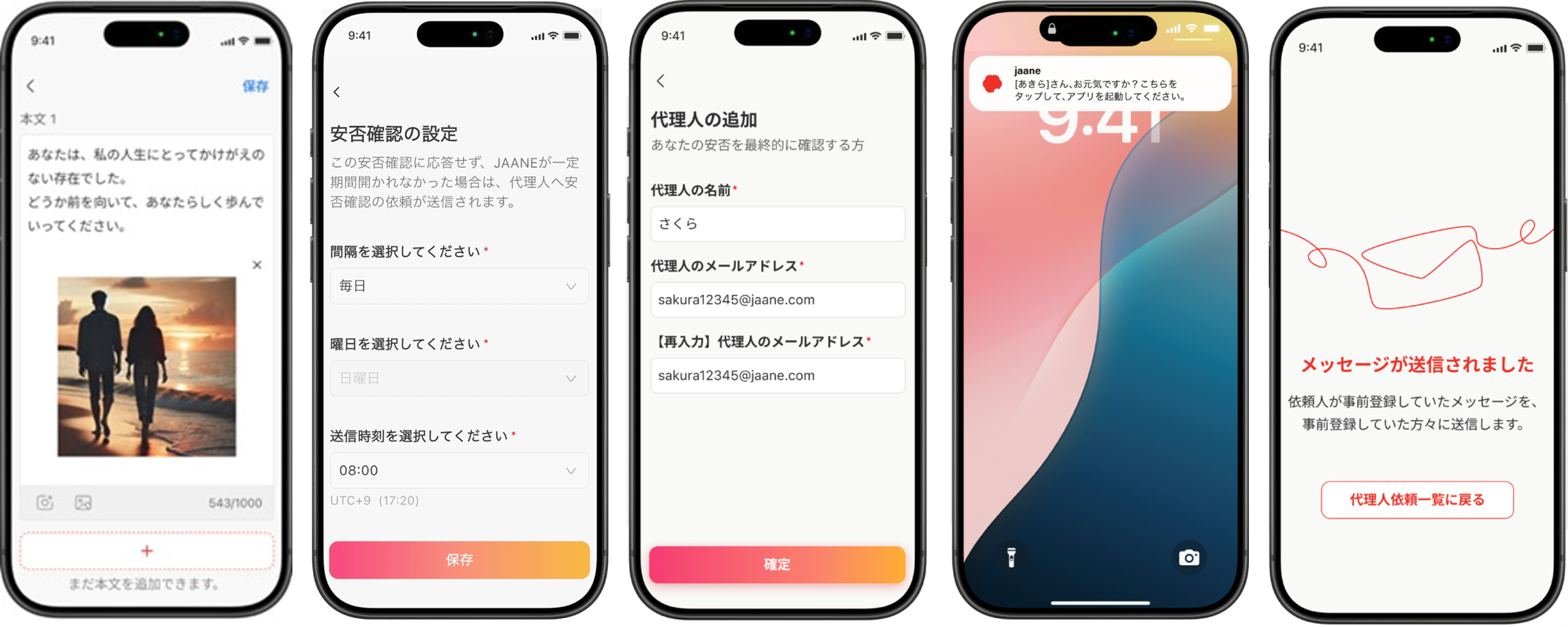 メッセージを残したい相手を考えることで「自分が誰を大切に思っているのか」を知るとともに、登録された相手にも通知が届くことで、「誰かが自分を想い大切にしてくれている」という事実が伝わります。『JAANE』は人々の愛を可視化するサービスです。