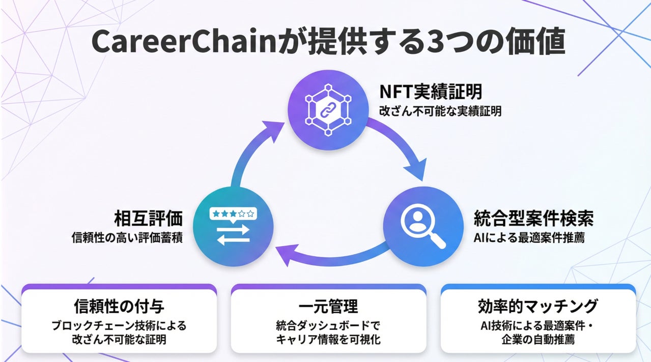CareerChainは、「NFT実績証明」「相互評価」「統合型案件検索」の3つの機能により、個人の価値を可視化し、案件マッチングに活かすキャリアプラットフォームです。