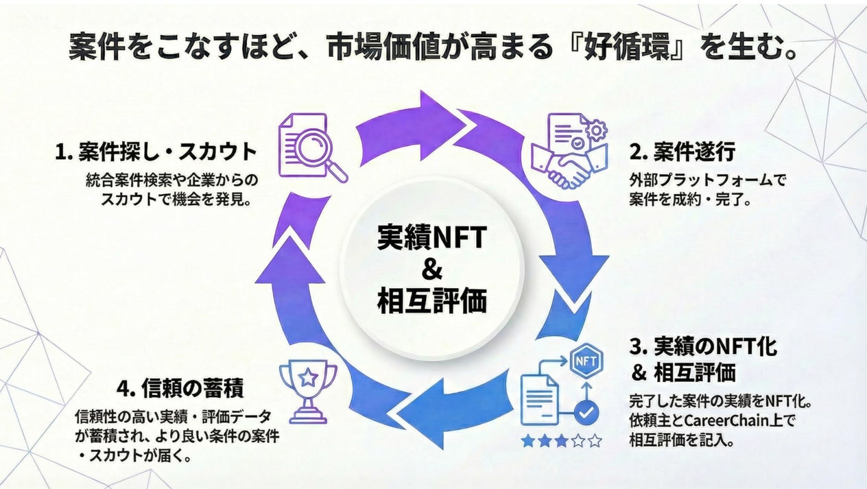 本サービスは、フリーランス・副業人材の職務経歴やプロジェクト実績を、改ざん不可能なNFT(Non-Fungible Token:非代替性トークン)として証明し、また案件終了時に相互評価による人材価値の見える化を図り、「自己申告」に依存してきた従来のキャリア評価の仕組みに新たな価値を提供します。