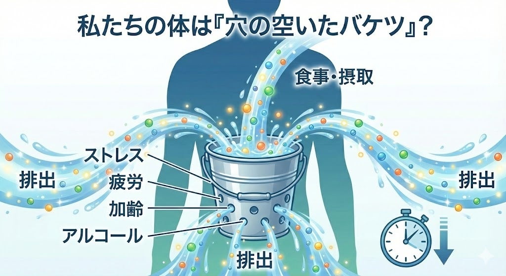 口の渇きと同じくらい深刻なのが、栄養の「維持能力」の変化です。 ストレス社会と言われる現代において、私たちの体は常に緊張状態にあり、代謝や修復のために大量の栄養素を消費しています。 特に、私たちは以下の成分を「3大フロー栄養素」と定義し、その対策の重要性を提唱しています。これらは体に留めておくことが難しく、まるで穴の空いたバケツのように常に流出してしまうからです。