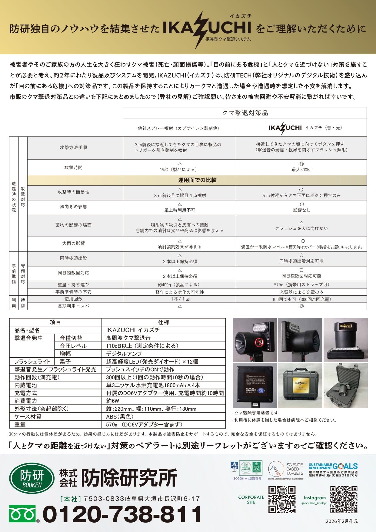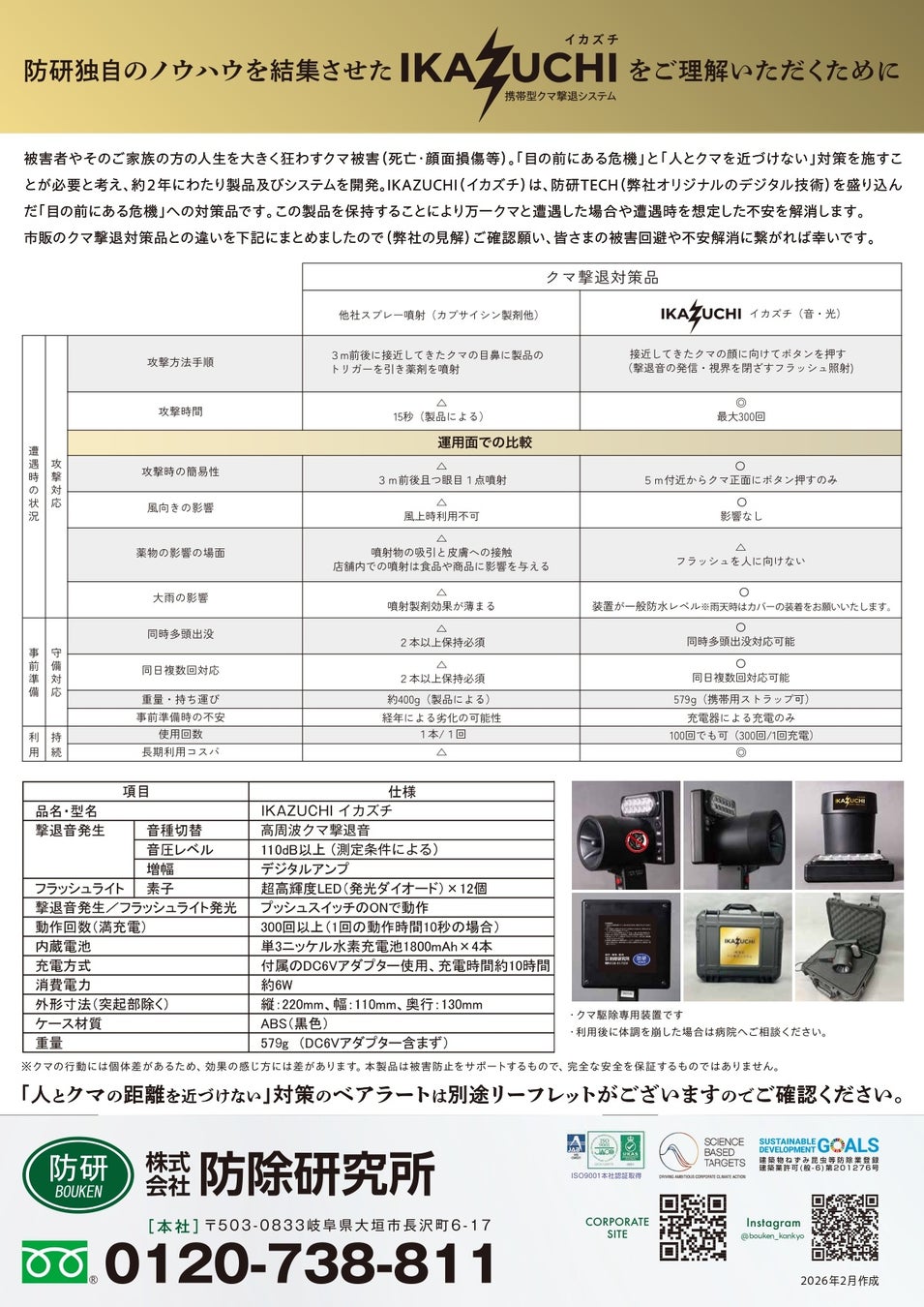 その第1弾として、音と光でクマを撃退する携帯型熊撃退器「イカズチ(IKAZUCHI)」を2026年2月末に発売いたします。本製品は、同社が長年の害獣対策現場で培ってきた独自技術体系 「防研TECH」に基づき開発されました。