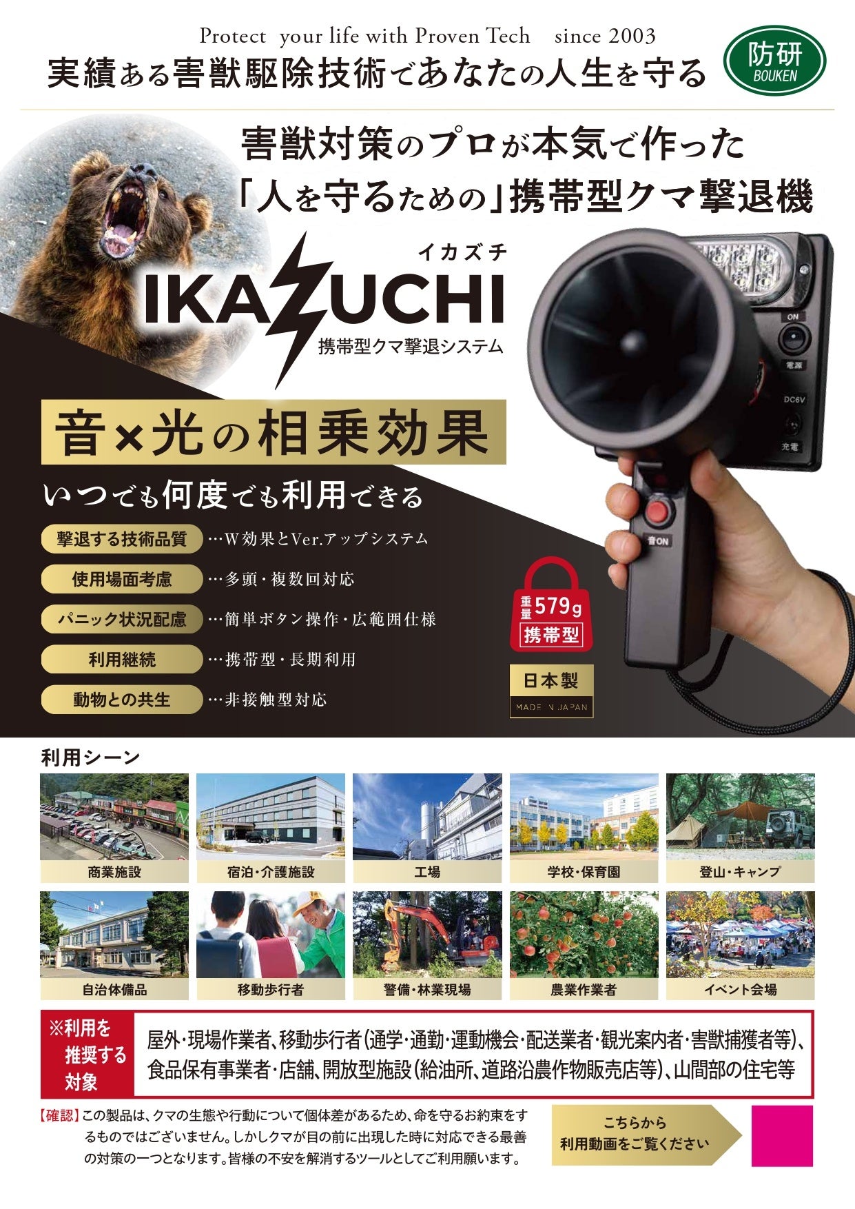 という形で、クマと人が接触しないための多層的な防除システムを構築します。「イカズチ」は、その中でも“人がクマと対峙してしまった瞬間を守るための最前線”を担う存在です。