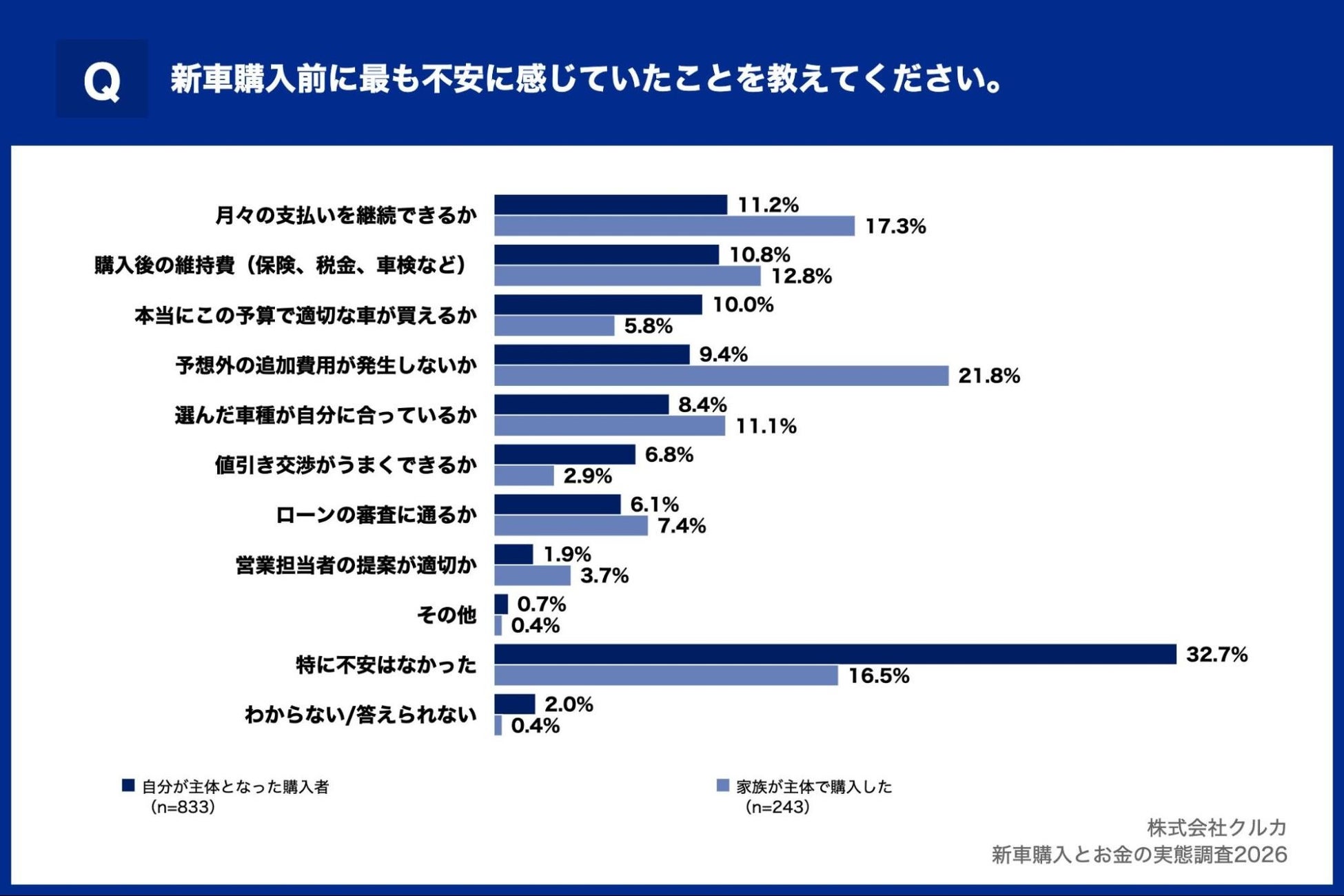 最後に、新車購入前に最も不安に感じていたことを比較しました。自分主体では「特に不安はなかった」が32.7%で最多となった一方、家族主体では16.5%にとどまり、16.2ポイントの差が生じています。