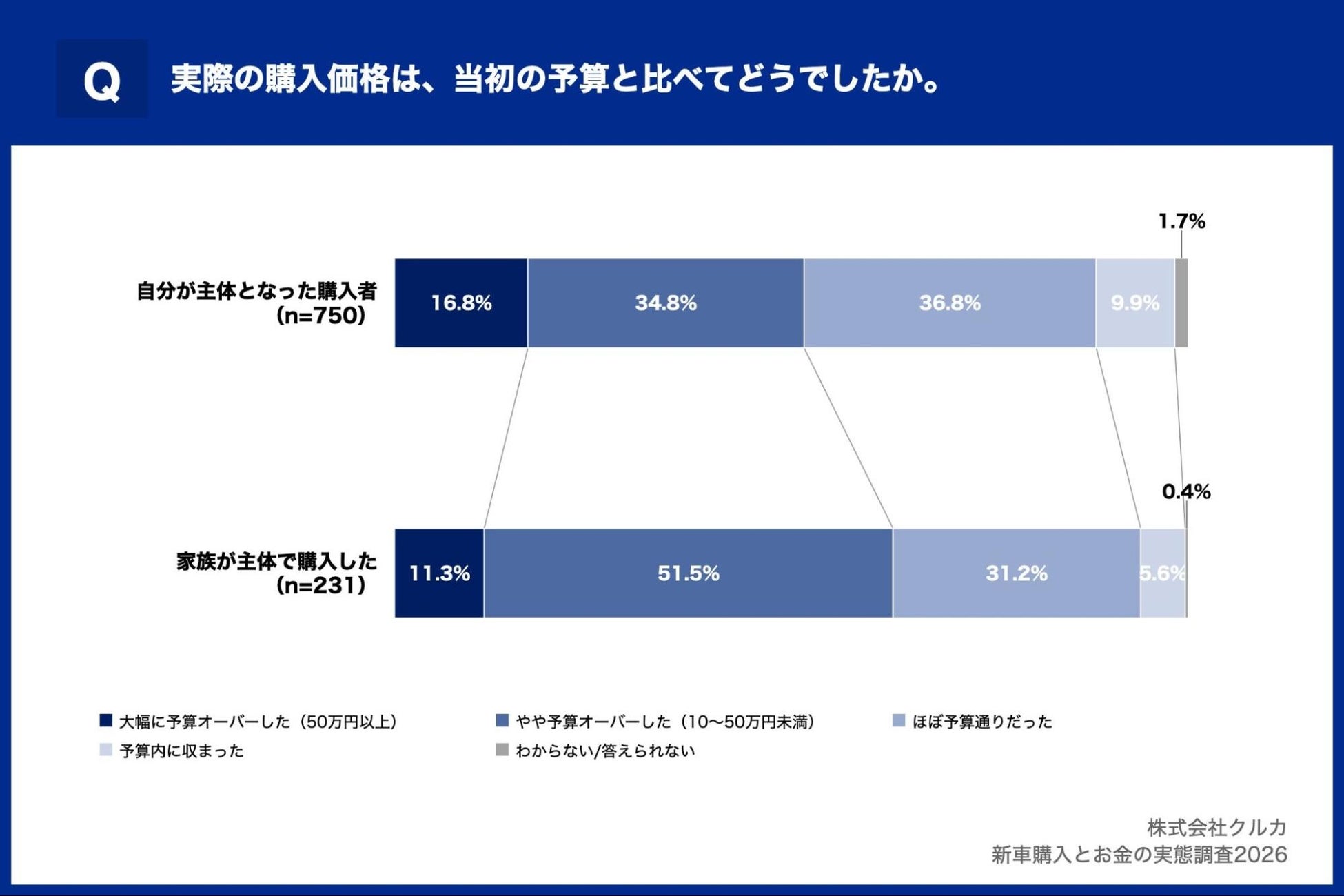 続いて、実際の購入価格と当初予算との差を比較しました。「大幅に予算オーバー(50万円以上)」または「やや予算オーバー(10〜50万円未満)」と回答した割合は、家族主体が62.8%となり、自分主体(51.6%)を11.2ポイント上回る結果となりました。