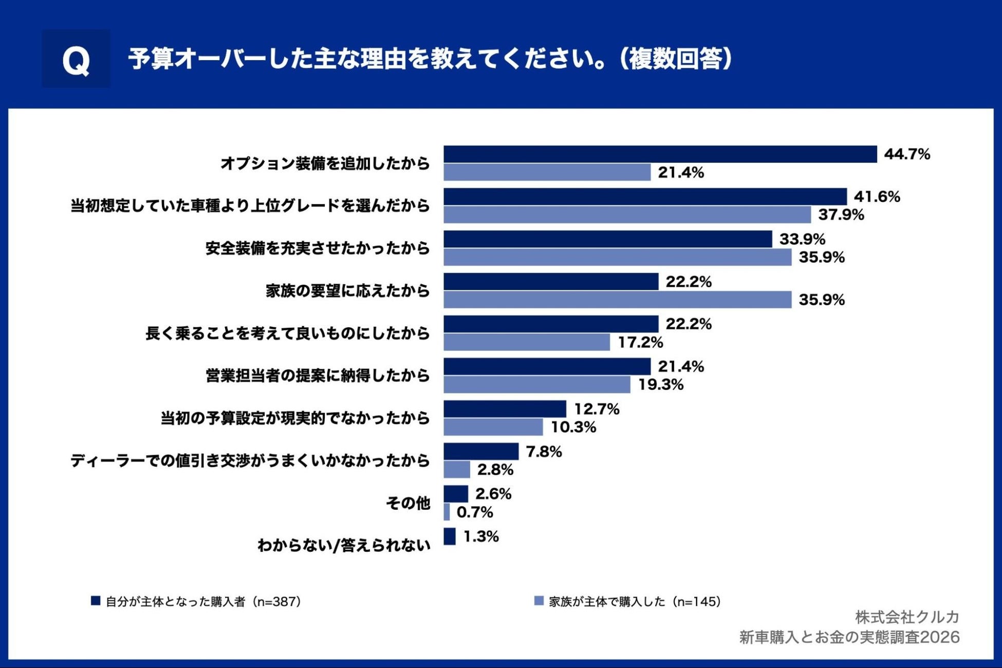 自分主体では「オプション装備を追加したから」が44.7%で最多となり、家族主体を23.3ポイント上回っています。一方、家族主体では「当初想定していた車種より上位グレードを選んだから」が37.9%、「安全装備を充実させたかったから」「家族の要望に応えたから」が各35.9%と上位を占めました。家族主体の購入では、安全性や家族の意見を優先することが予算超過につながりやすい傾向がうかがえます。