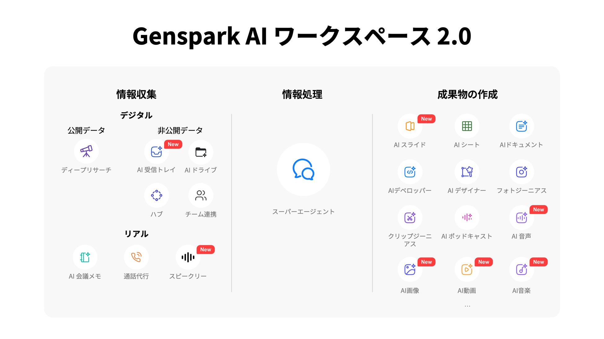 シリコンバレー発の次世代オールインワン AI ワークスペース「Genspark」は、2026年1月28日、ホワイトカラーの業務効率化に貢献する新機能を一気に拡充するAIワークスペース 2.0を発表し、日本での法人展開を本格化することを発表しました。