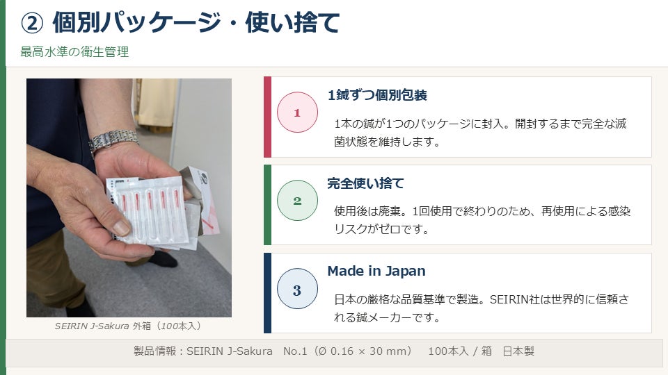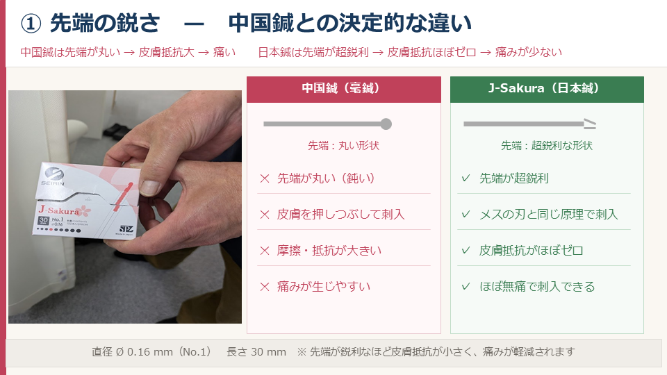 ※日本橋クリニックでは直径0.16㎜の細い使い捨ての鍼を使うことで痛みの少ない鍼治療を心がけております。