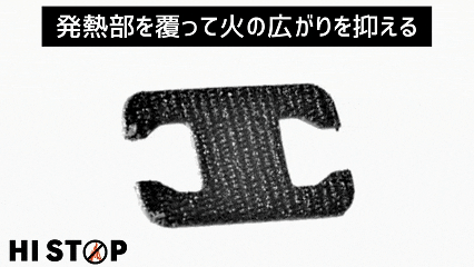過熱が進行すると内部素材が反応し、発熱部を覆うことで燃焼の進行を抑える仕組みを採用。
