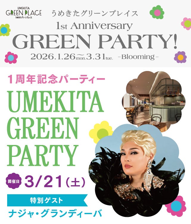 SNS投稿キャンペーンに応募いただいた方の中から抽選でご招待する“UMEKITA GREEN PARTY “は、ゲストとしてナジャ・グランディーバ氏ほか、パーティーに彩りを添える多数のドラァグクイーンが登場。華やかなドラァグクイーンの軽快なトークや写真撮影をお楽しみいただける1日限りの限定パーティーです。参加者にはドレスコードを設定し「something flower」をテーマとした花や緑を取り入れた装いで参加いただく催しとなり、非日常感を味わっていただけます。