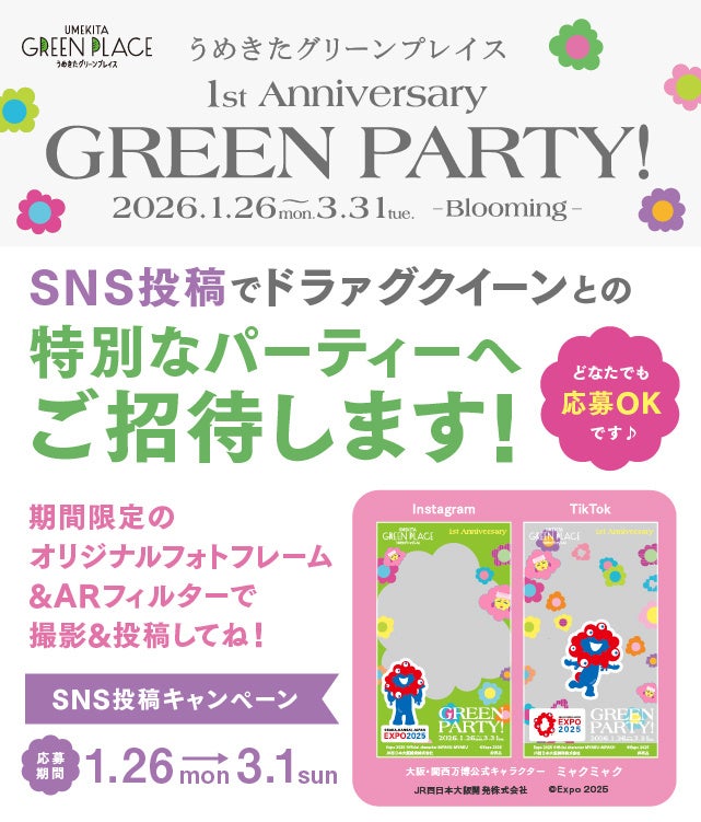 JR大阪駅うめきた地下口直結の「うめきたグリーンプレイス」を運営するJR西日本大阪開発(株)(代表:明瀬寛昭)は、開業1周年を記念して『UMEKITA GREEN PARTY-Blooming-』を2026年1月26日(月)~3月31日(火)まで開催します。