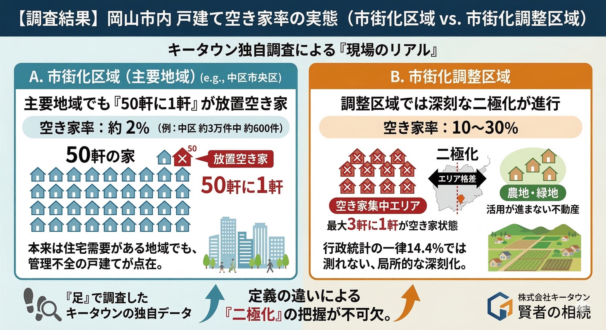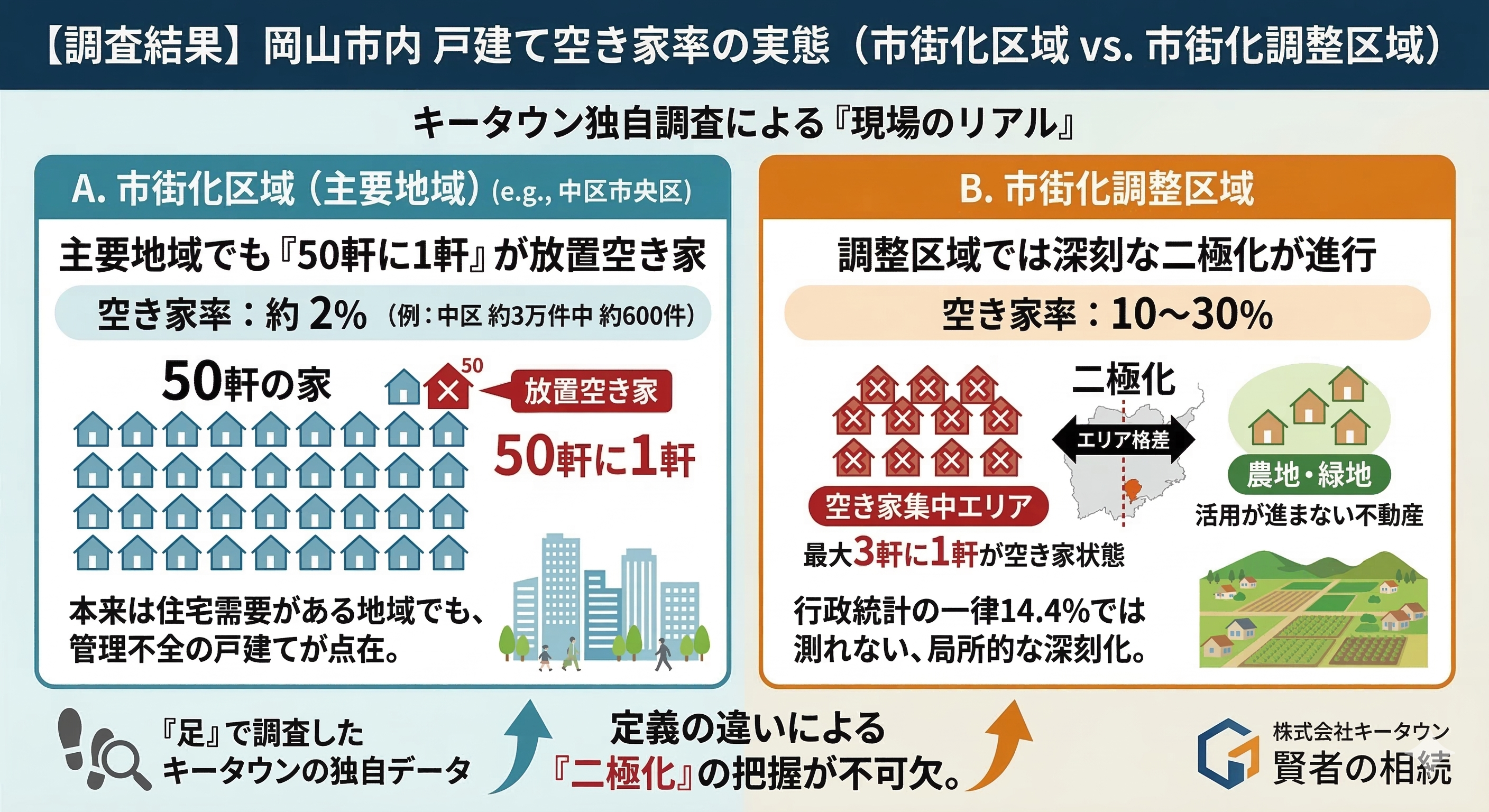 戸建て21.5万戸のうち約3万件を現地目視で調査。主要地域でも空き家率2%、調整区域では10〜30%に達するエリアも