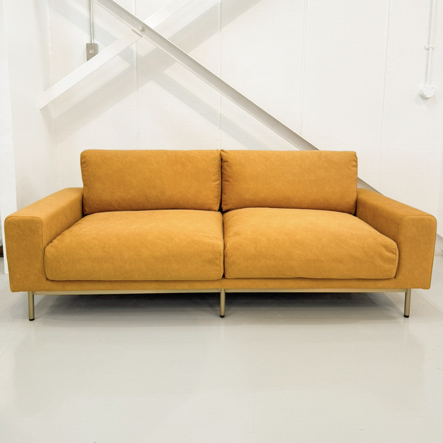 今回、「ウンコちゃんの家具屋さん」は同ブランドとチームアップし、プルートシリーズから3人掛けソファを別注商品として販売いたします。低めの設計とルーズな張り感、たっぷりと使用した柔らかなフェザーによって、くったりと沈み込むこだわりの座り心地が特長です。張地には、柔らかく保温性にも優れたウール混フランネル生地を採用。汗染みや耐摩耗性などの耐久試験でも高い結果が出ており、水温30度以下で洗濯機洗いが可能な点も嬉しいポイントです。あぐらもかけるほど広々とした奥行きのある座面に、ボリューム感のある肘掛けを組み合わせた開放的なデザイン。思わず全身を預けたくなる沈み込みと、包み込まれるような感触を楽しめます。さらに、本体を支えるすっきりとしたスチール脚とのコントラストが、軽やかで洗練された印象を演出します。