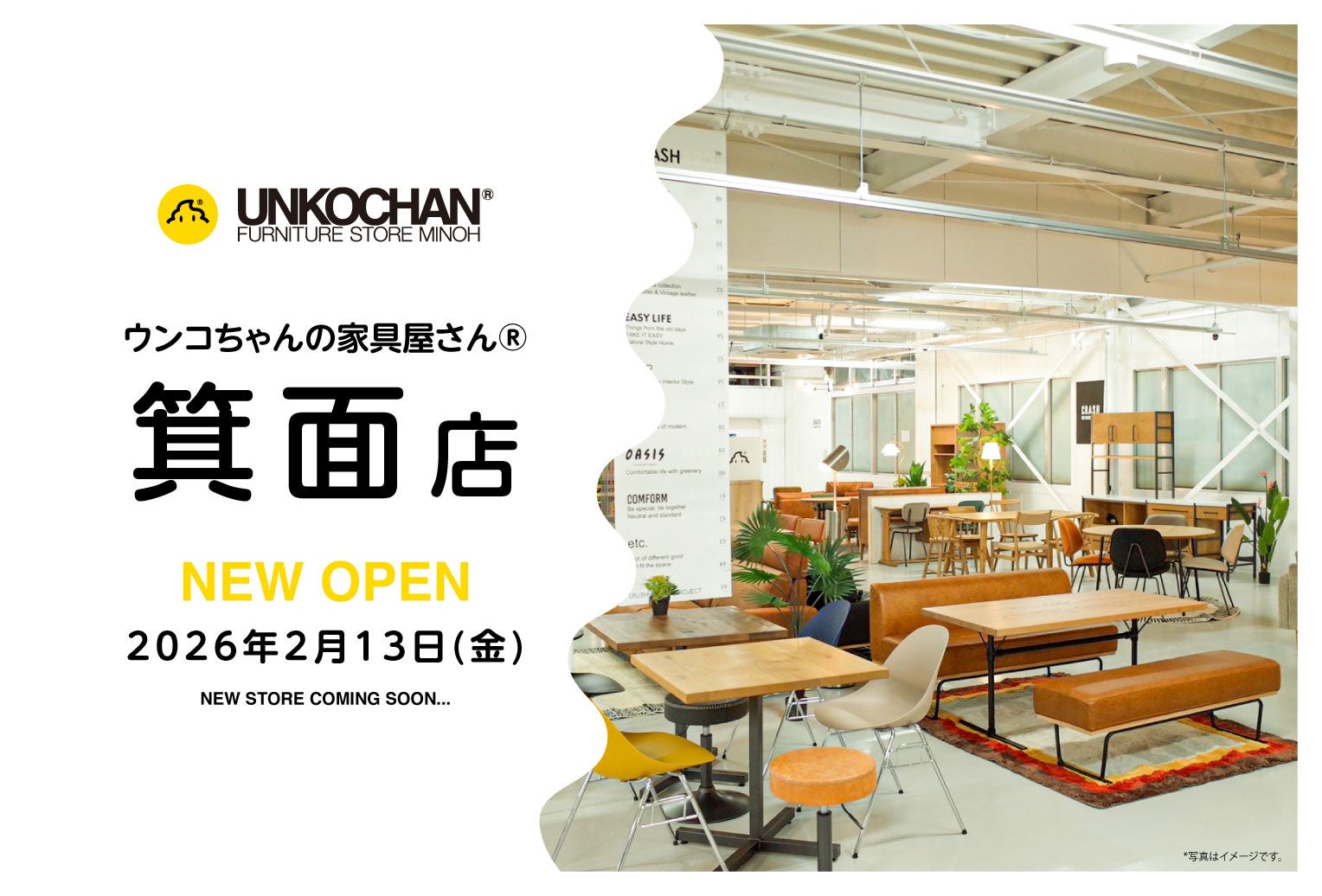 この度、株式会社 木楽家本舗(本社:大阪府八尾市、代表取締役社長:大町圭司)が運営する、家具と雑貨のワンダーランド「ウンコちゃんの家具屋さん」は、2026年2月13日(金)に「ウンコちゃんの家具屋さん 箕面店」をオープンいたします。大阪府・兵庫県下で5店舗目となる同店は、広さ1,315㎡を誇り、北摂エリア最大級の規模での出店となります。