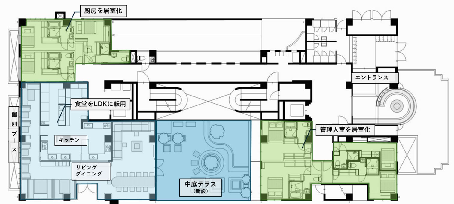 広いタイプの間取りや一部の共用部を居室化。37室の居室数を転用により62室へと増設し、高い収益性を実現。