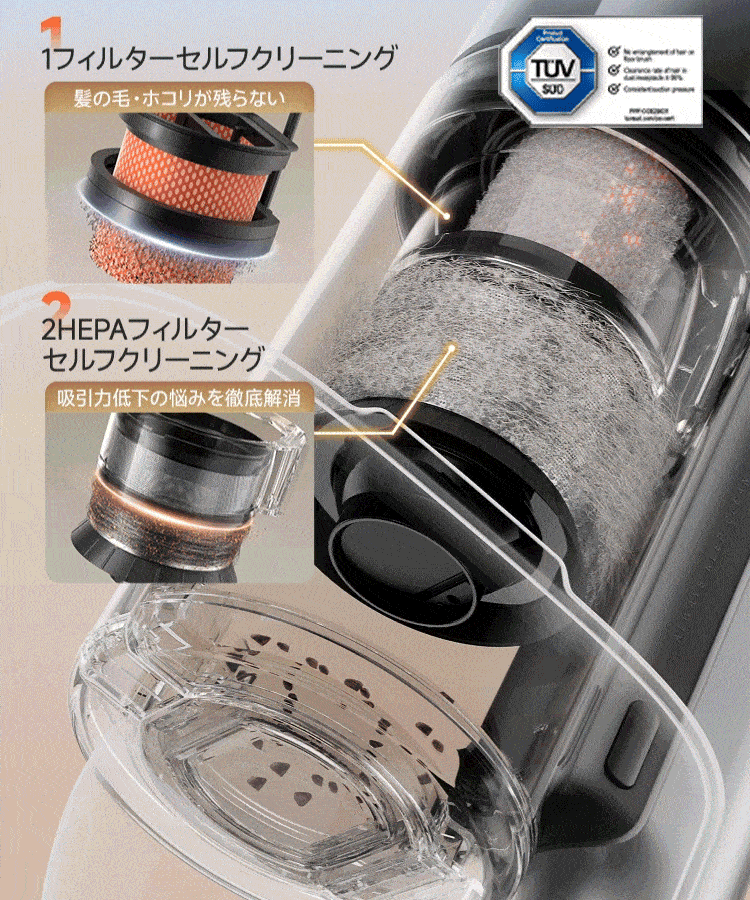 それによって、フィルターの目詰まりが防止でき、手動メンテナンス不要となり、掃除するたびに、常に安定した吸引力が維持できる