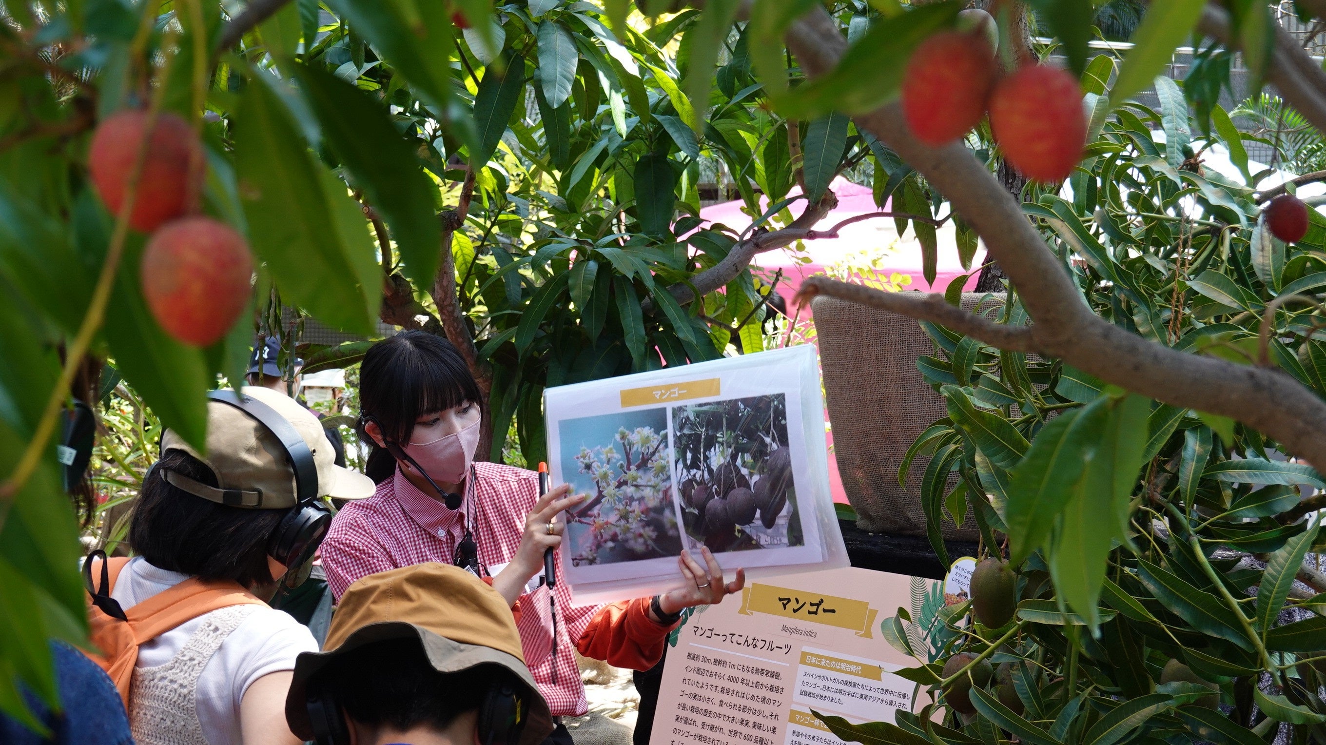 ◆ガイドツアーでは、学びながら展示する熱帯フルーツの実る姿を見る