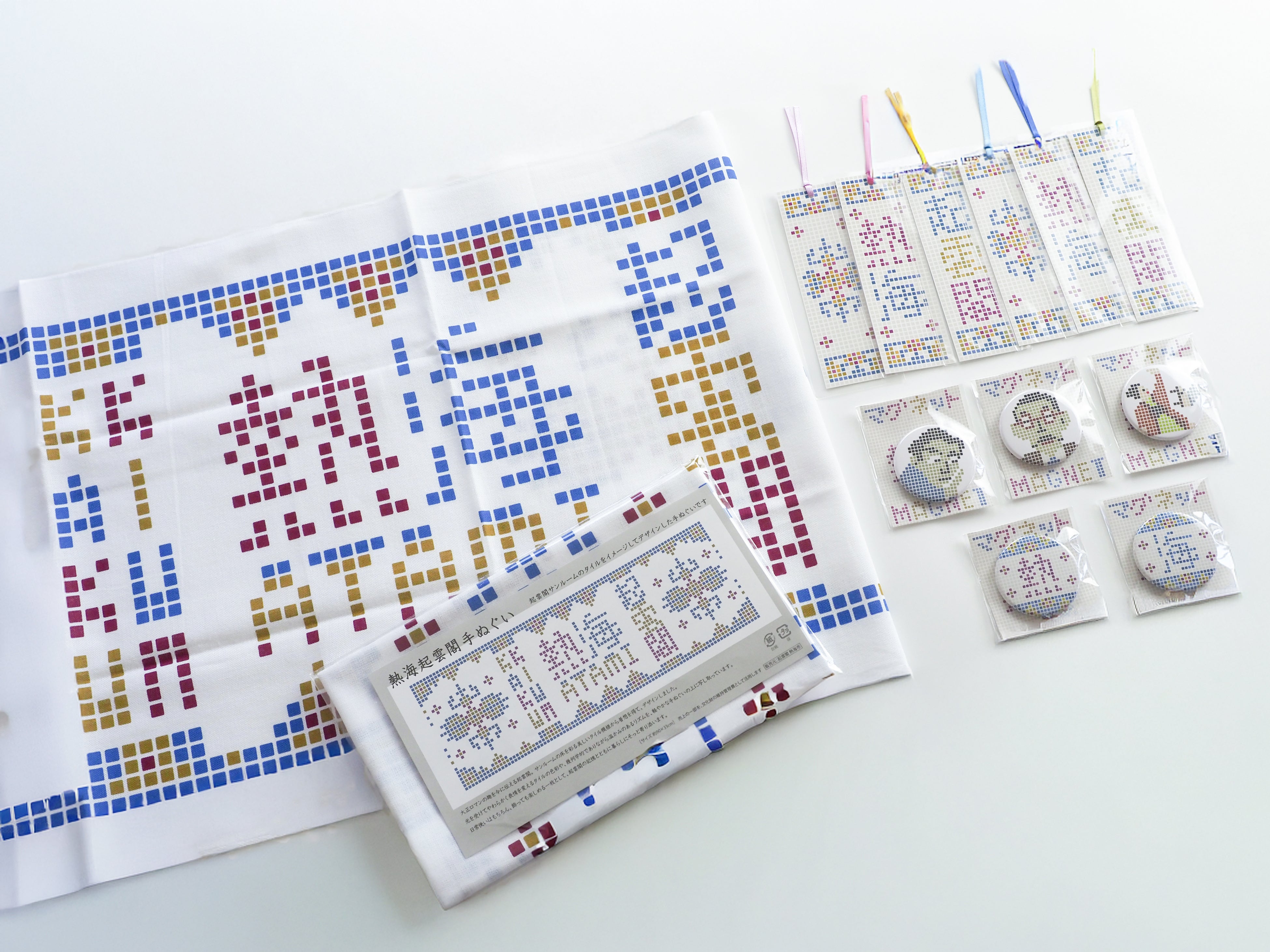 贅を尽くした別荘建築が魅力の起雲閣のなかで、近年「かわいい」と人気の高い「泰山タイル」。熱海市の別荘文化をもっと発信していきたいという思いから、モザイク模様を活かした新たなおみやげ「熱海起雲閣手ぬぐい」「熱海マグネット缶バッジ」「熱海起雲閣しおり」の3種を制作、販売することとなりました。