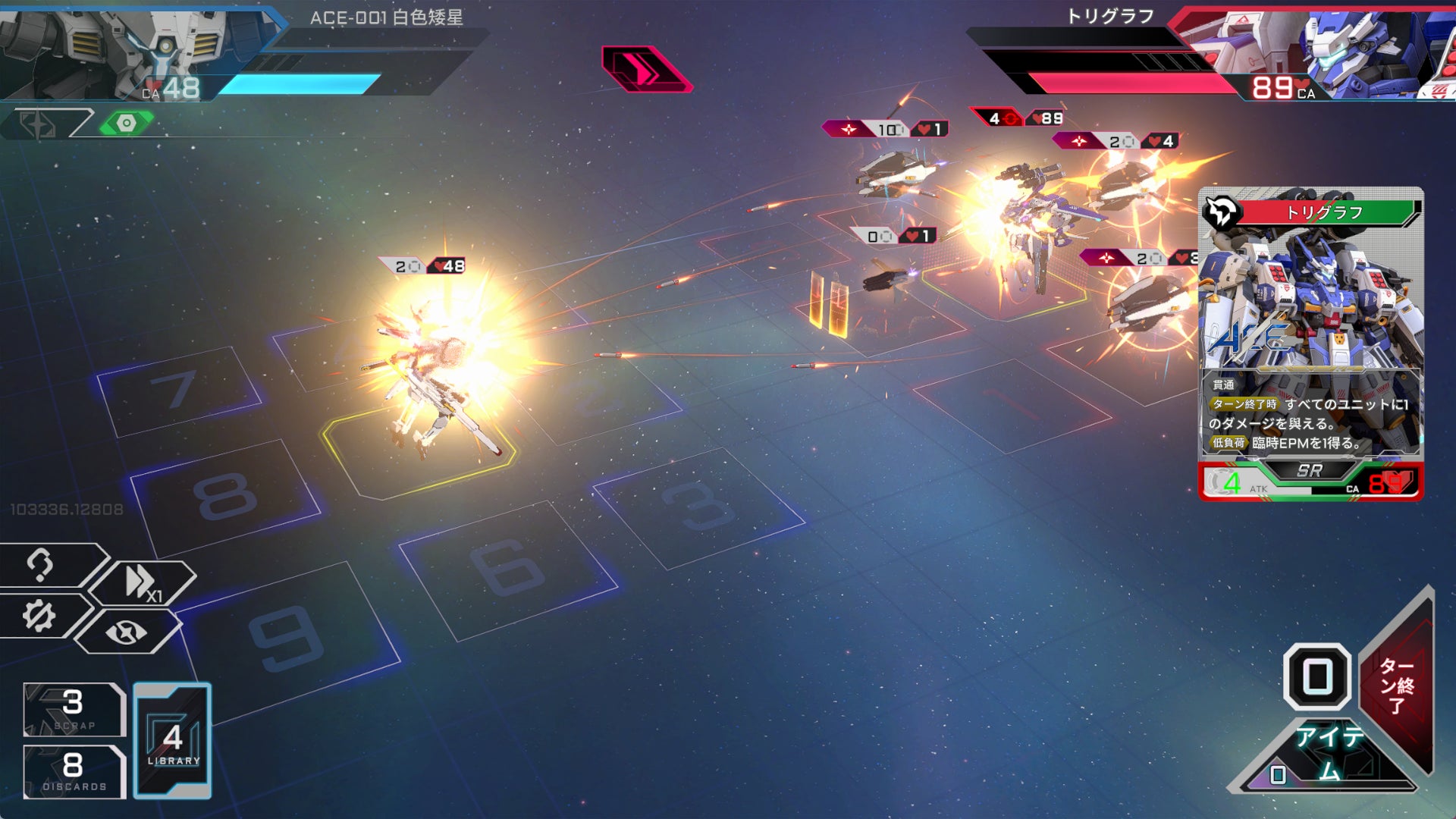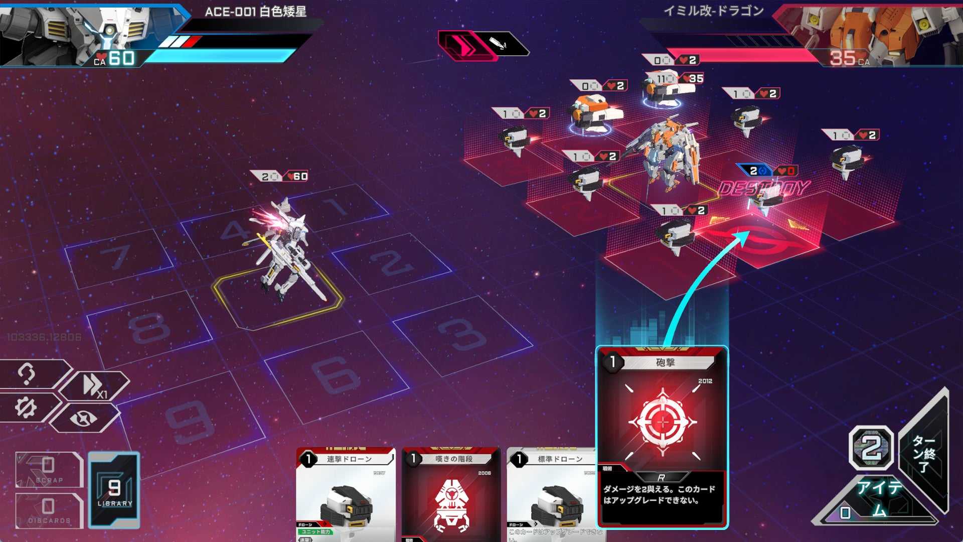 パイロットごとにカード効果が変化し、ドローン配置によるエリアコントロールや、位置関係を活かしたスキル連鎖が発生します。