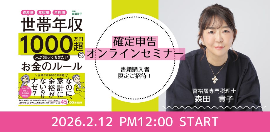 富裕層専門税理士として30年のキャリアを持つ森田貴子(株式会社ウィル・シャイン代表)は、2025年12月22日に刊行された著書『資産増、年収増、余裕増 世帯年収1000万円超の人が知っておきたいお金のルール』(あさ出版)の購入者を対象とした、特別オンラインセミナーを開催いたします。
