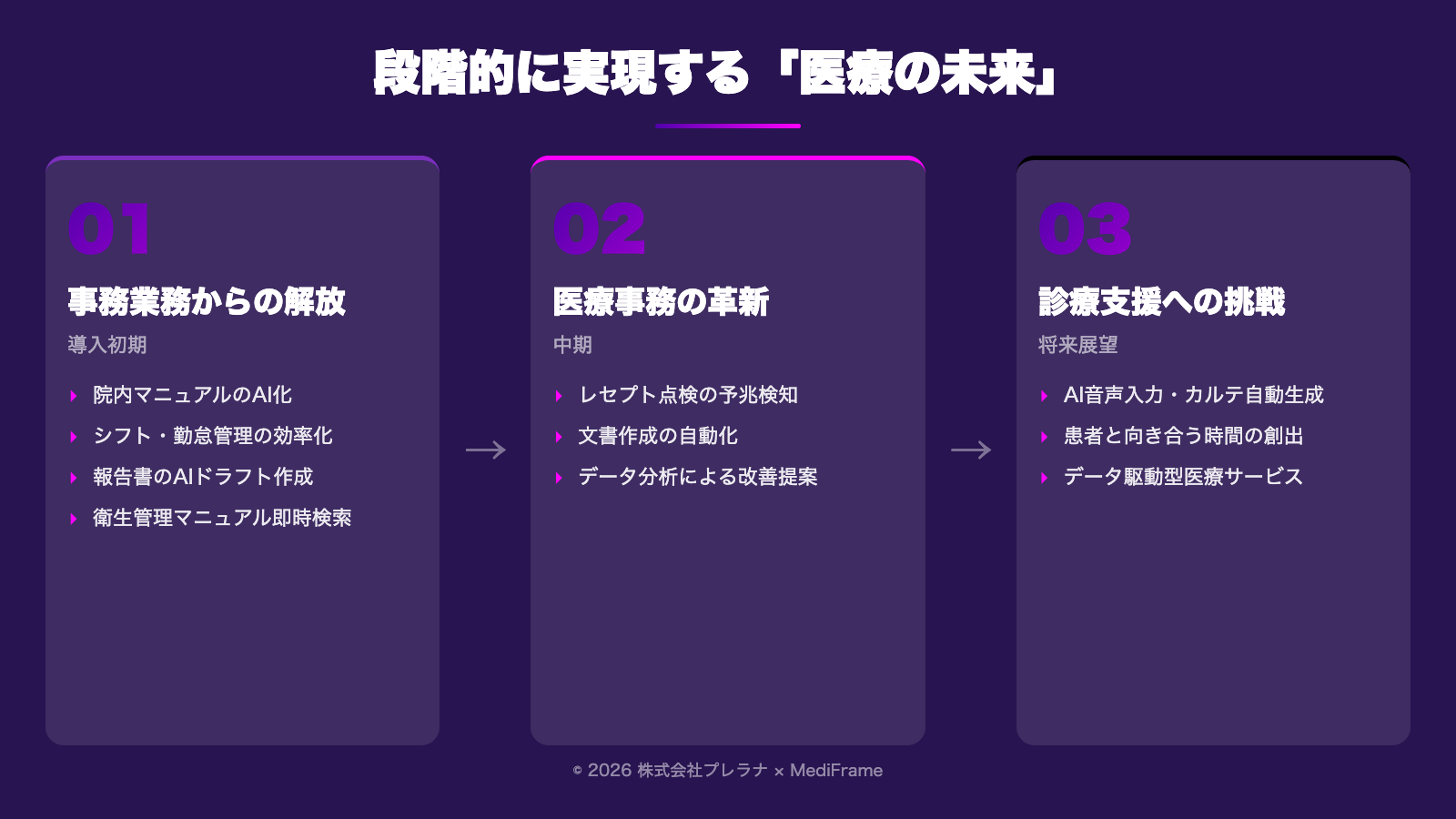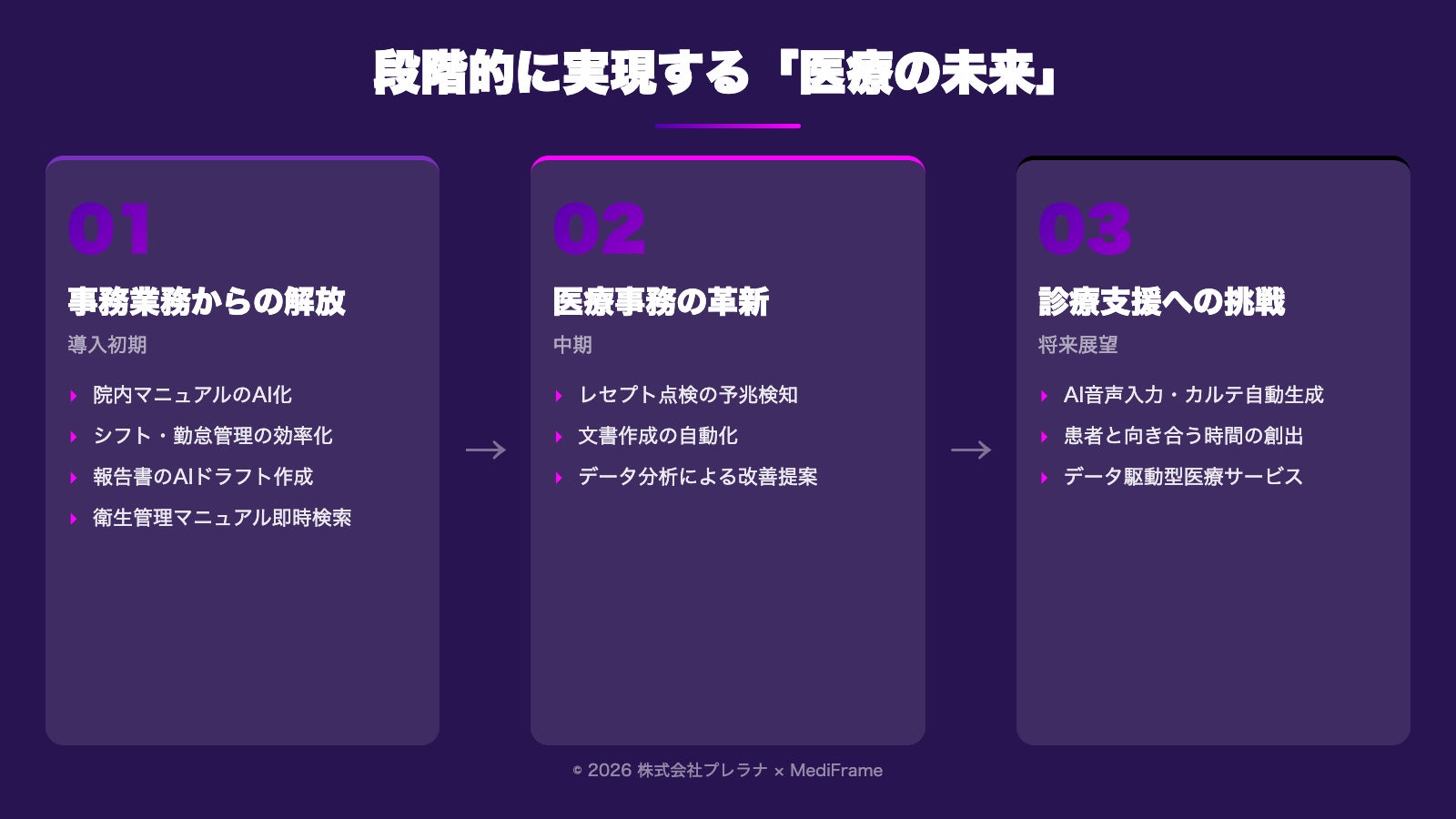 本サービスは、医療現場の安全性とセキュリティを最優先に、段階的なAI導入により医療機関の未来を変革していきます。